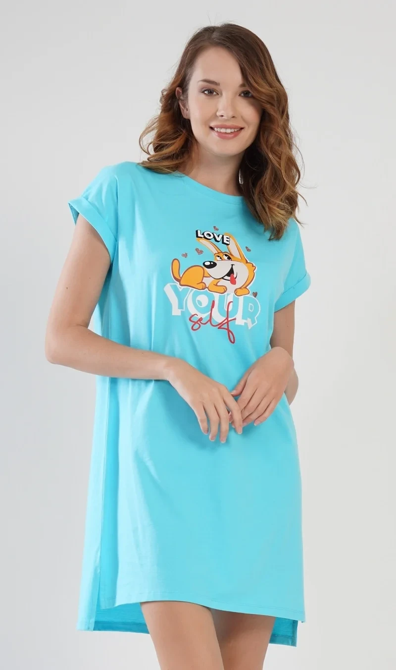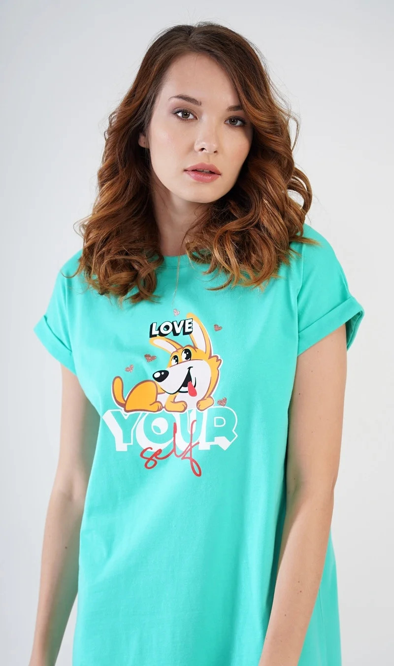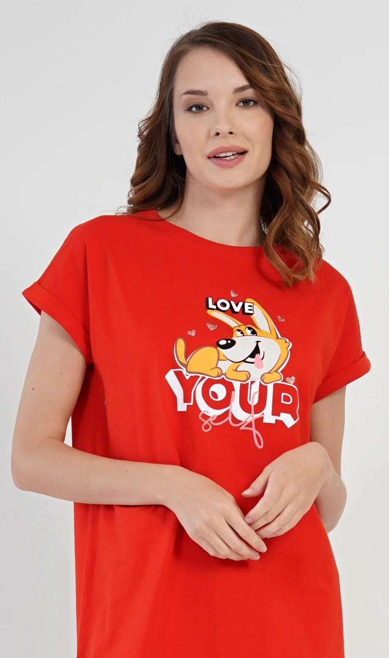 Dámská bavlněná noční košile s krátkým rukávem Love your self. Noční košilka s efektem ohrnutých rukávů má na hrudi obrázek roztomilého pejska obklopeného srdíčky, ležícího na nápisu Love your self. Použitý bavlněný materiál je příjemný a poddajný na dotek.