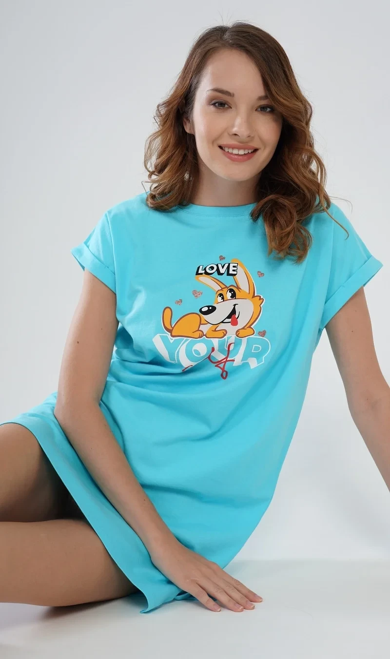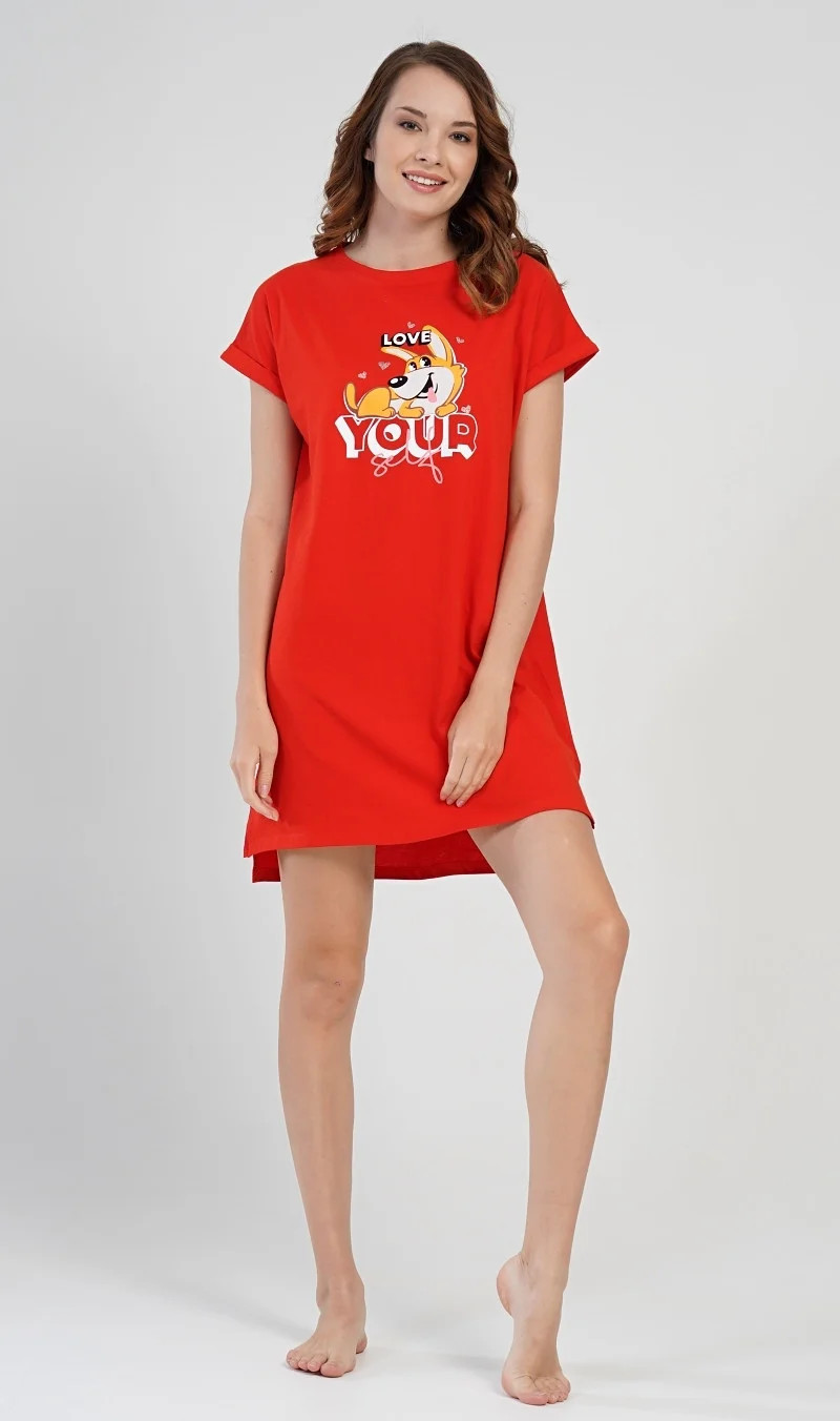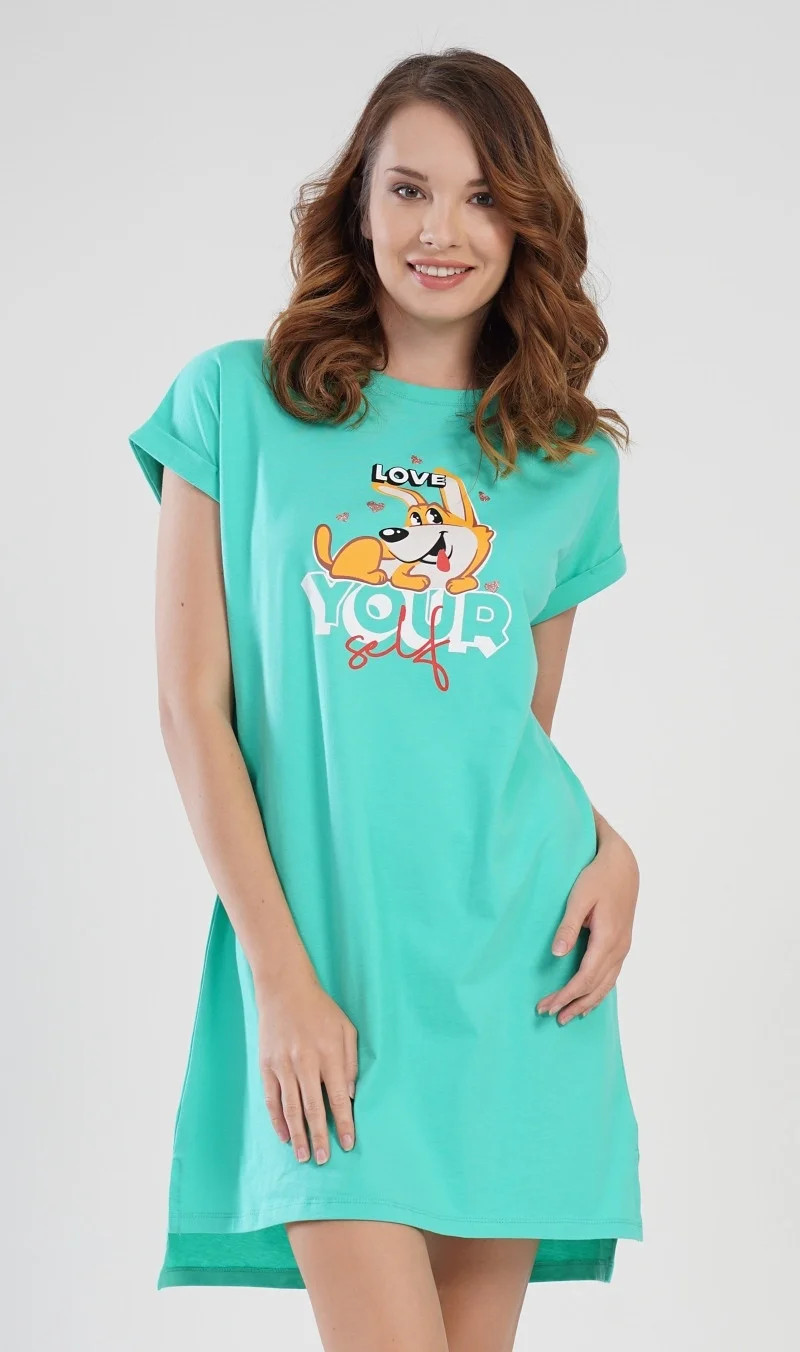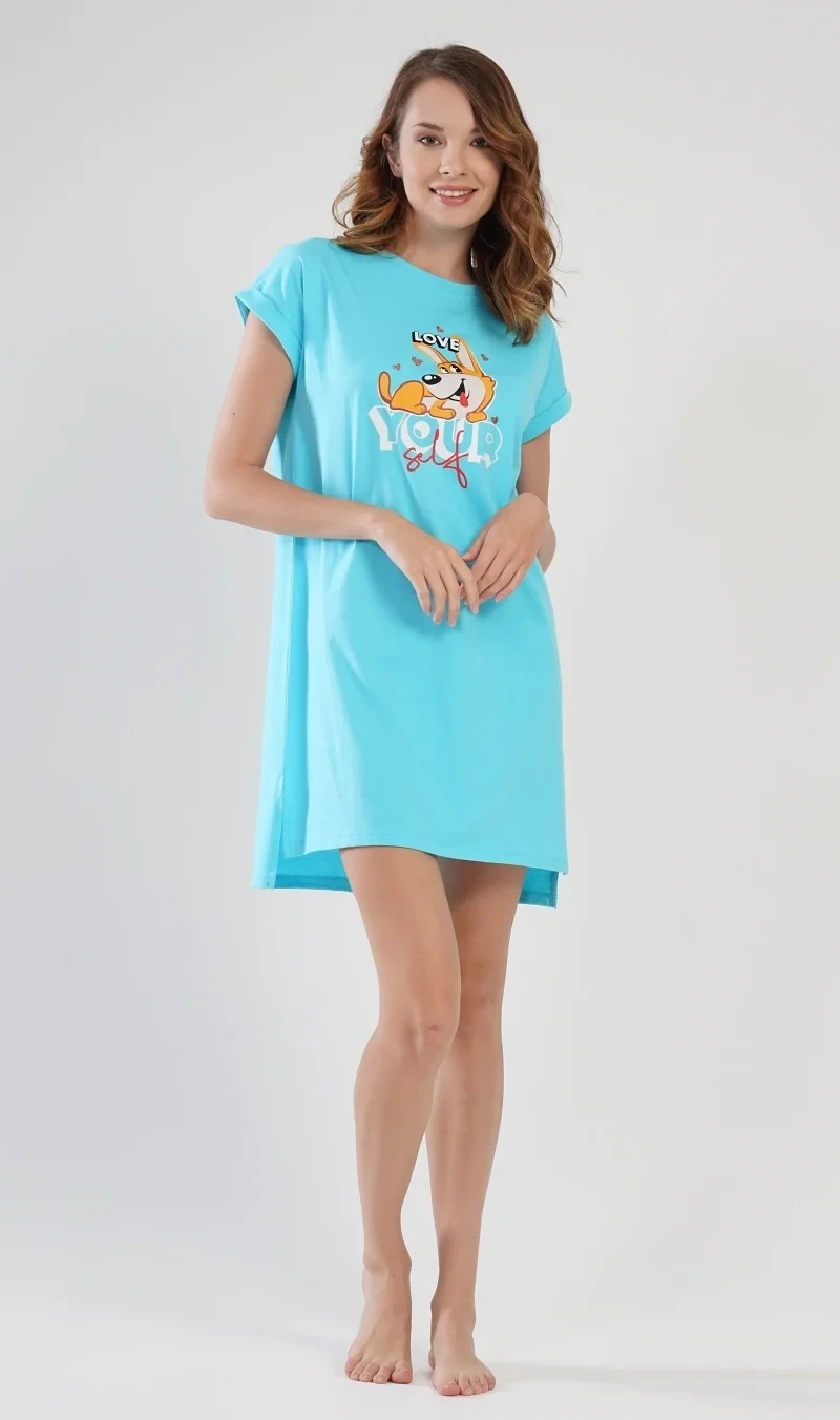 Dámská bavlněná noční košile s krátkým rukávem Love your self. Noční košilka s efektem ohrnutých rukávů má na hrudi obrázek roztomilého pejska obklopeného srdíčky, ležícího na nápisu Love your self. Použitý bavlněný materiál je příjemný a poddajný na dotek.