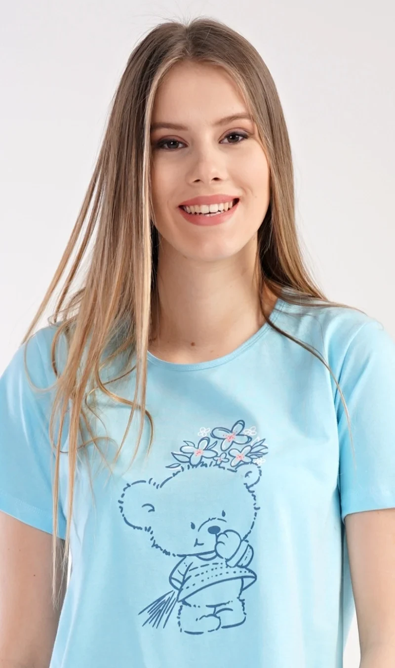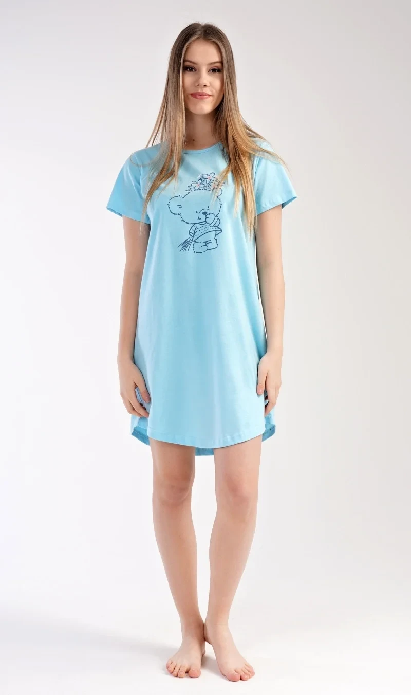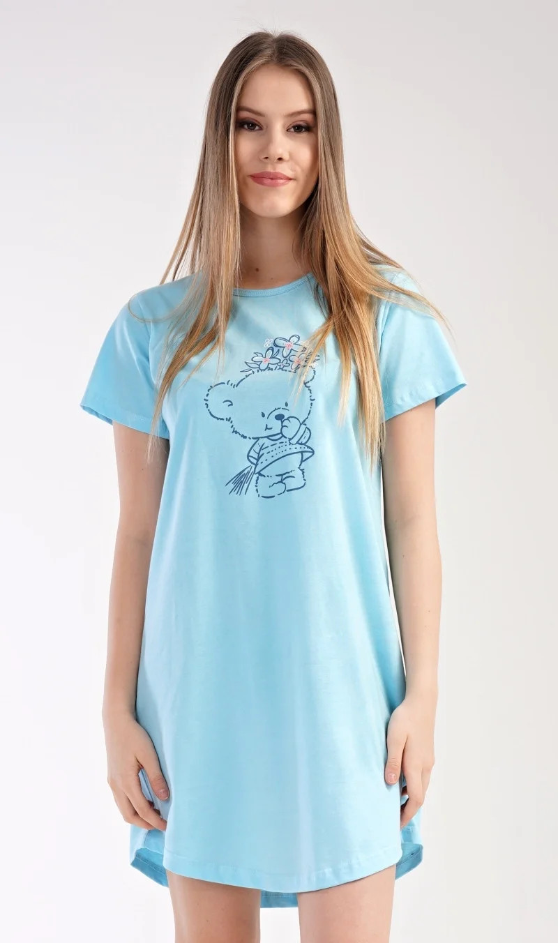 Dámská bavlněná noční košile s krátkým rukávem Méďa s kytkou. Noční košili s kulatým výstřihem zdobí obrázek medvídka, který za zády drží kytici květů. Použitý bavlněný materiál je příjemný a poddajný na dotek.