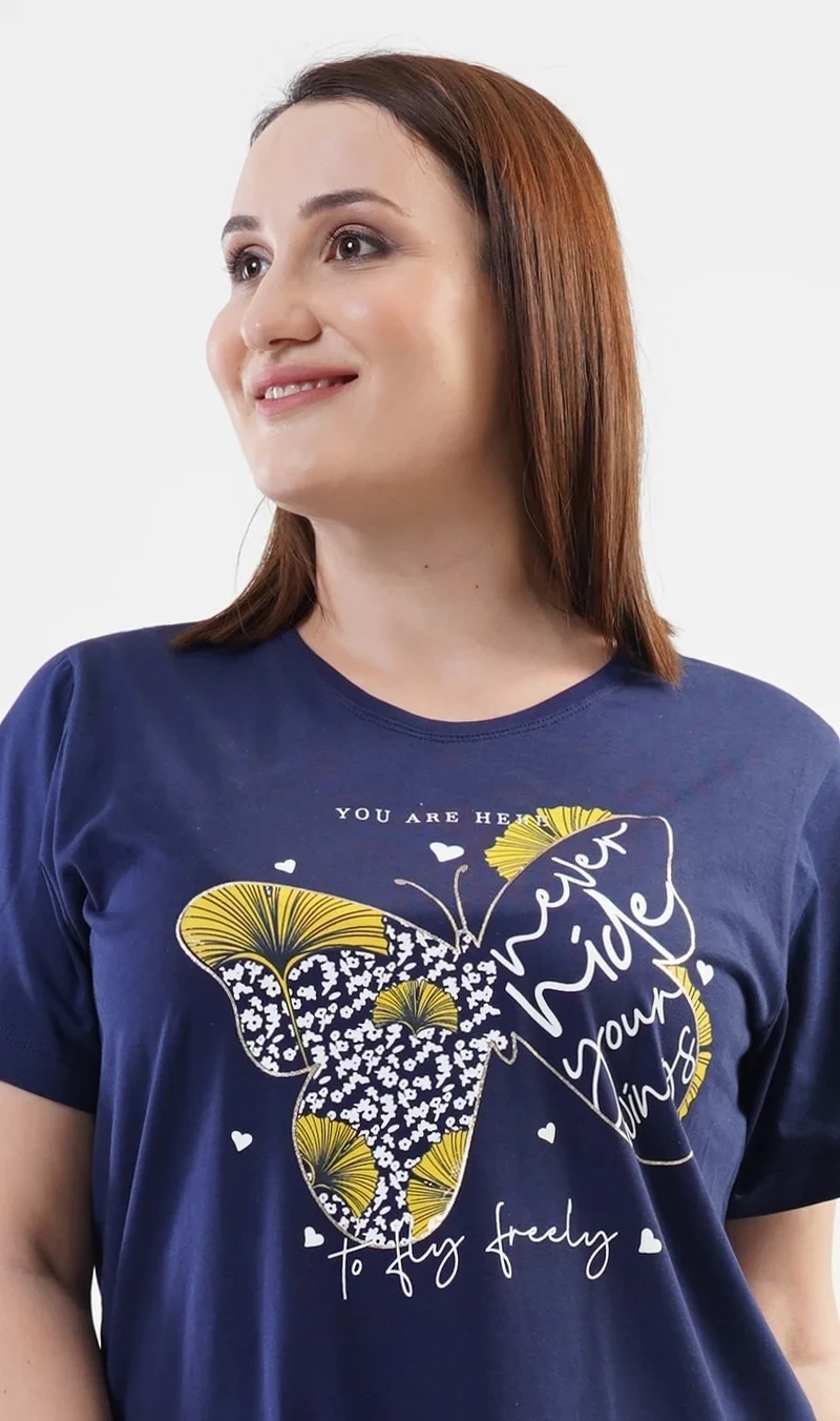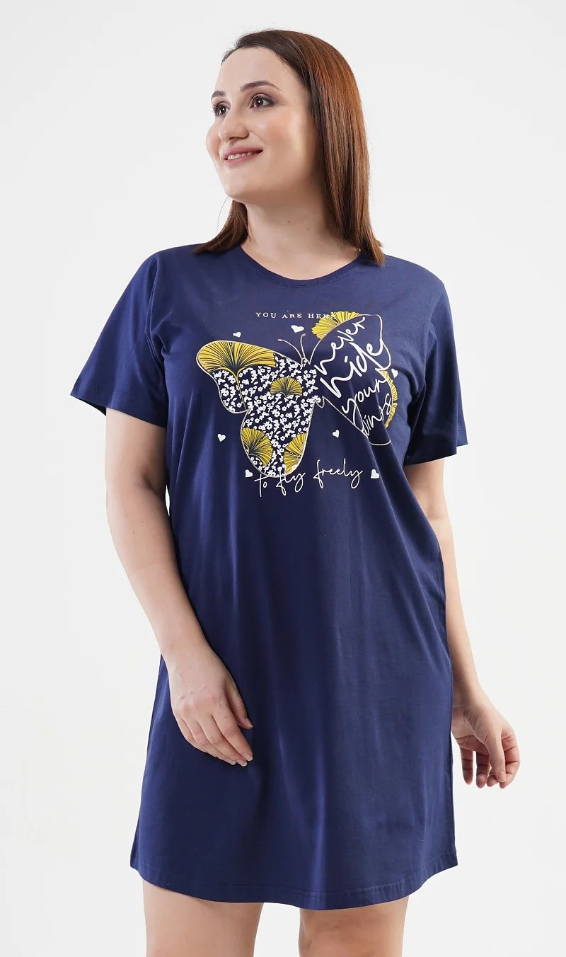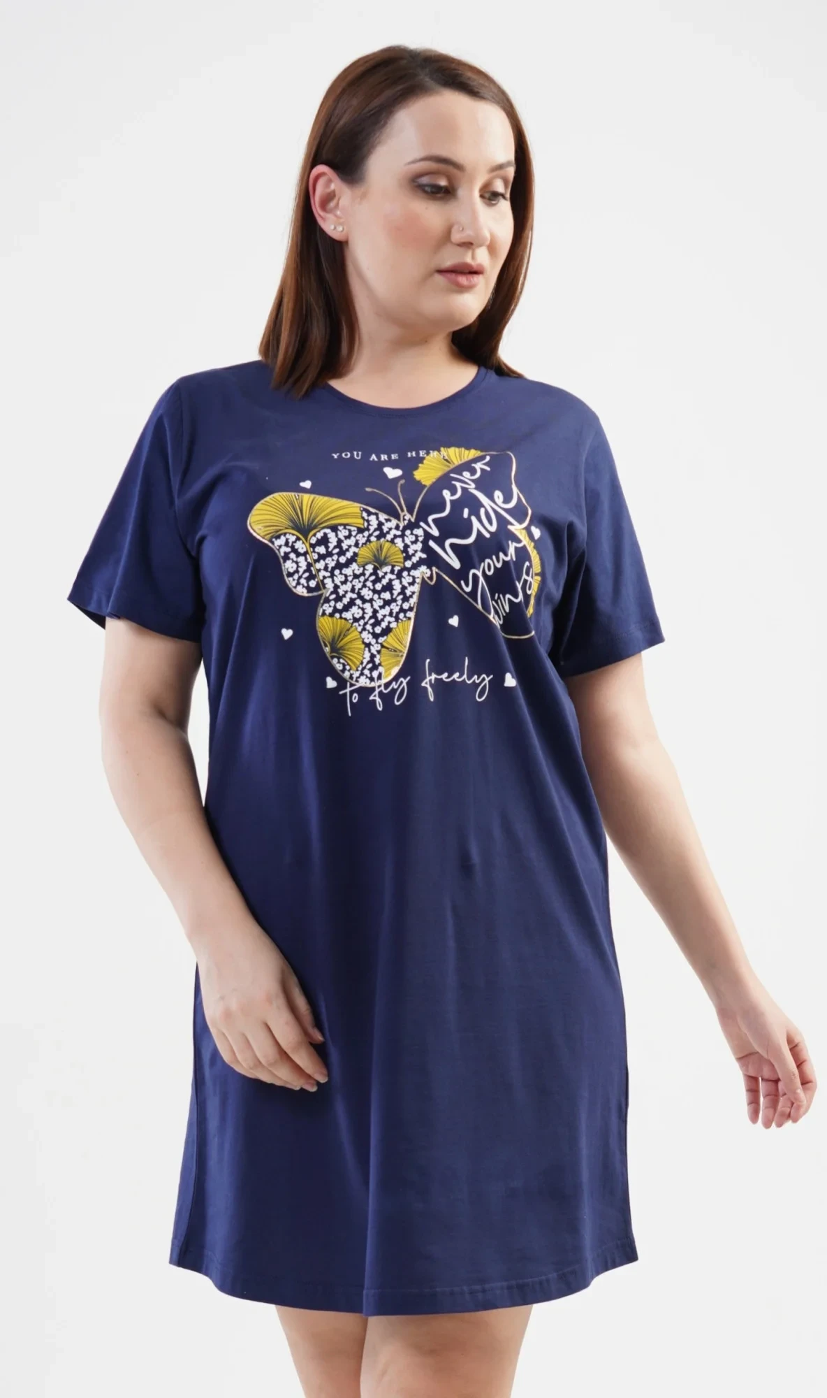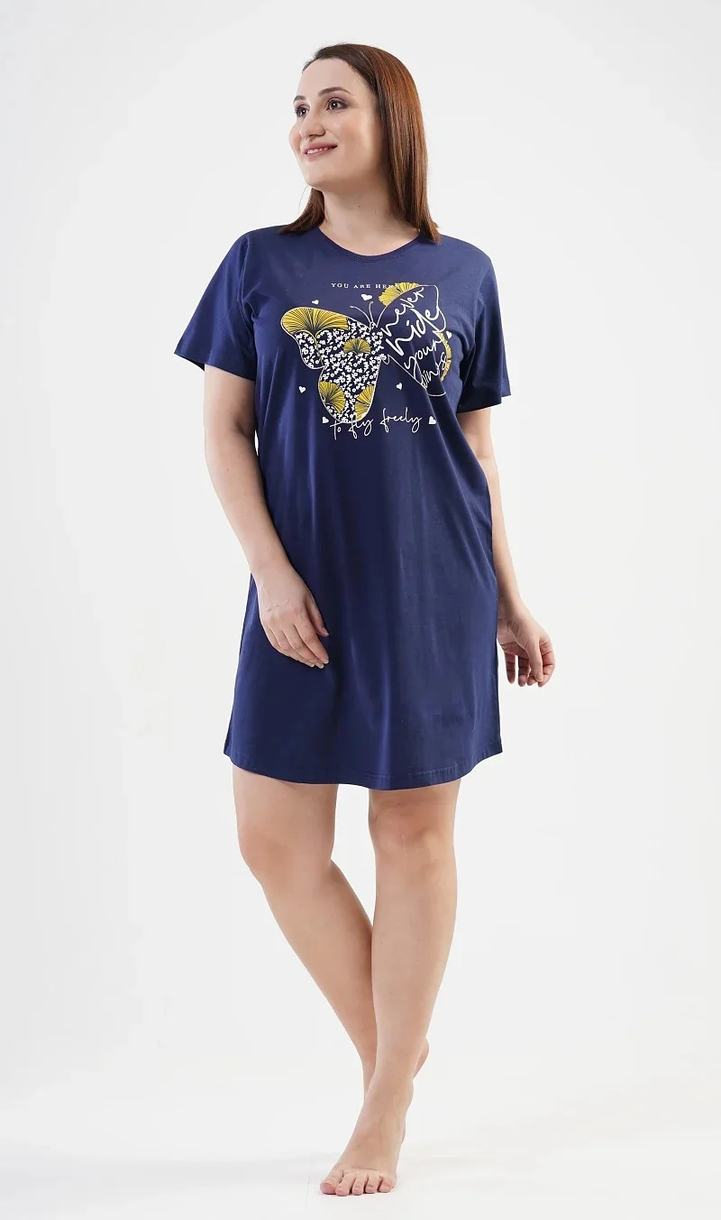 Dámská noční košile s krátkým rukávem Melanie. Dámská noční košile má na hrudi velikého motýla, který je částečně tvořen nápisem Never hide your Wings. Použitý materiál je jemný a poddajný na dotek. Košile je vhodná na denní nošení.