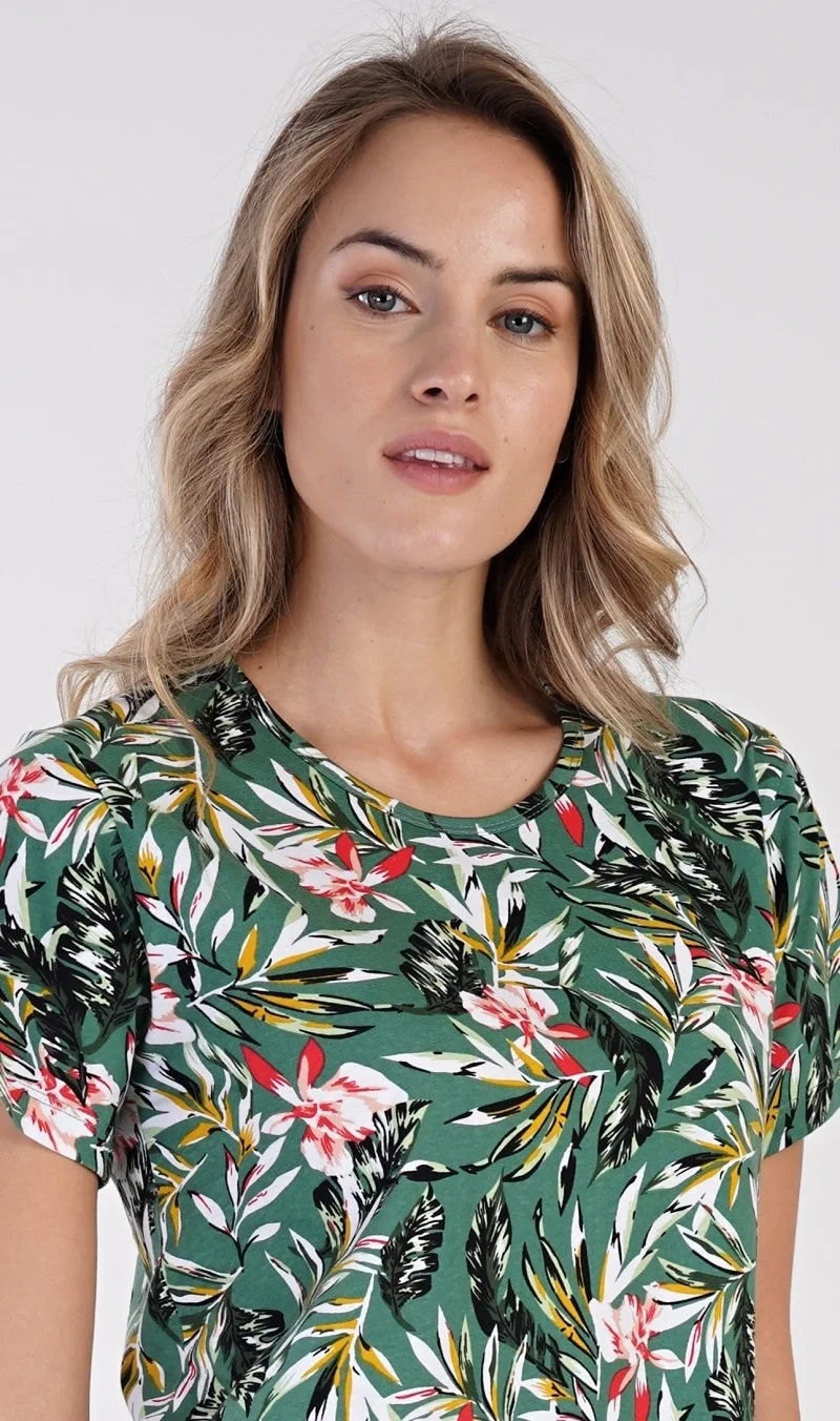 Dámská bavlněná noční košile s krátkým rukávem Michaela. Dámská noční košile s kulatým výstřihem má příjemnou délkou nad kolena. Košile s krátkým rukávem je potištěna motivy džungle, převažuje smaragdová barva. Použitý bavlněný materiál je příjemný a poddajný na dotek.