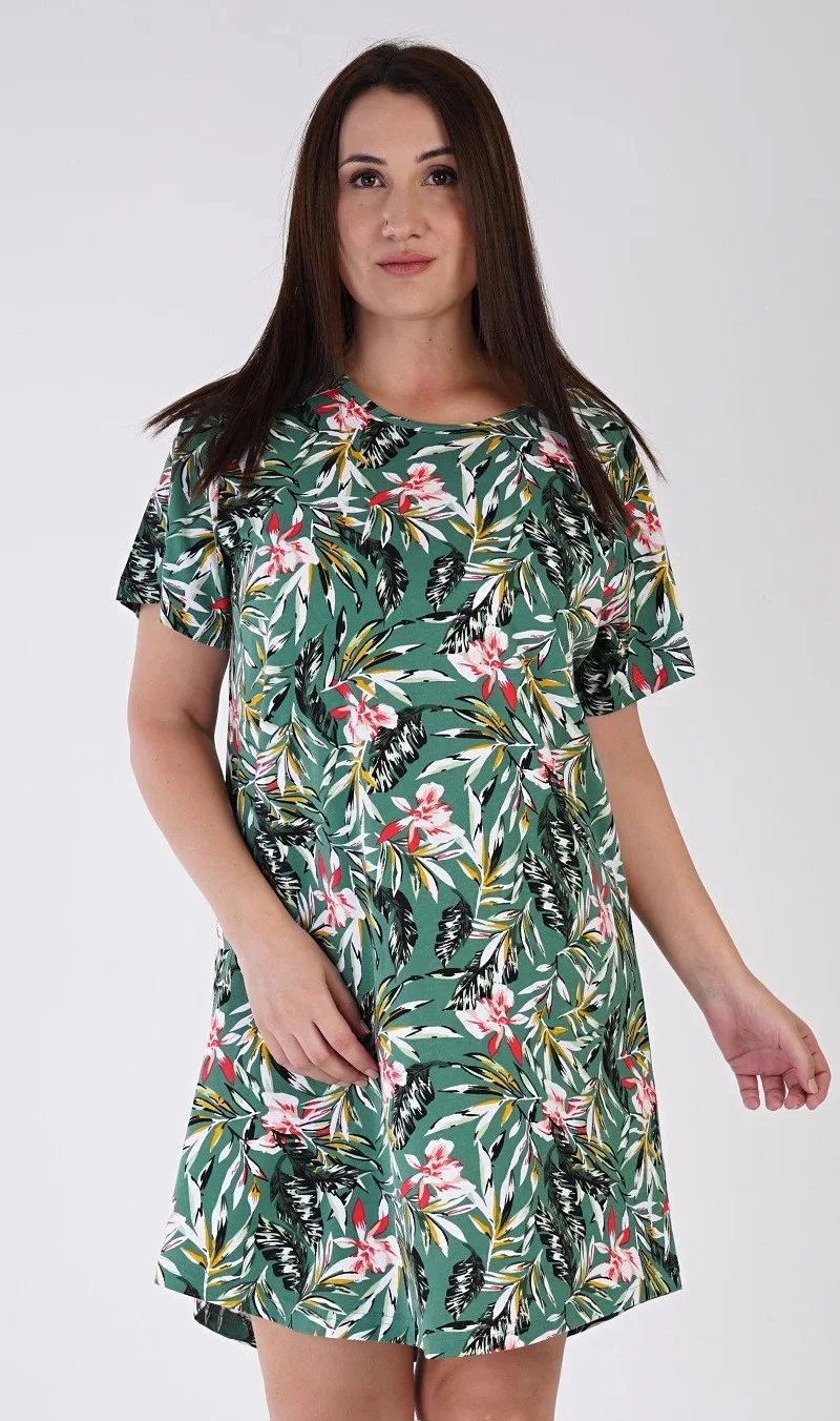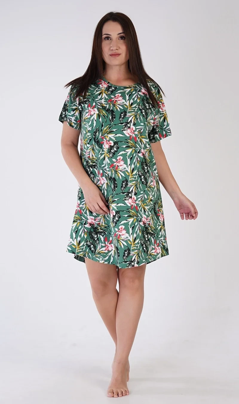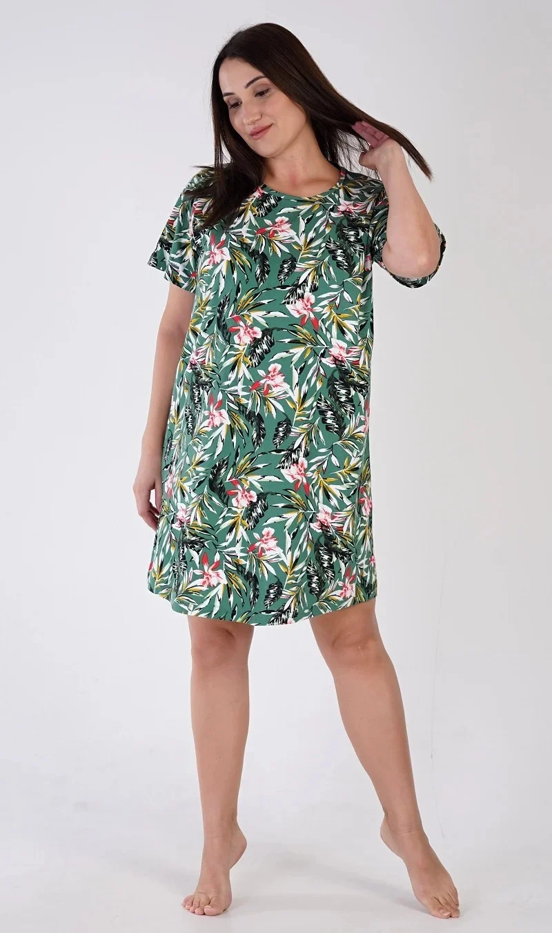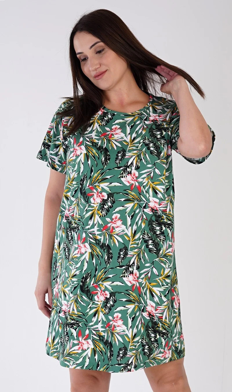 Dámská bavlněná noční košile s krátkým rukávem Michelle. Dámská noční košile s kulatým výstřihem má příjemnou délkou nad kolena. Košile s krátkým rukávem je potištěna motivy džungle, převažuje smaragdová barva. Použitý bavlněný materiál je příjemný a poddajný na dotek.
