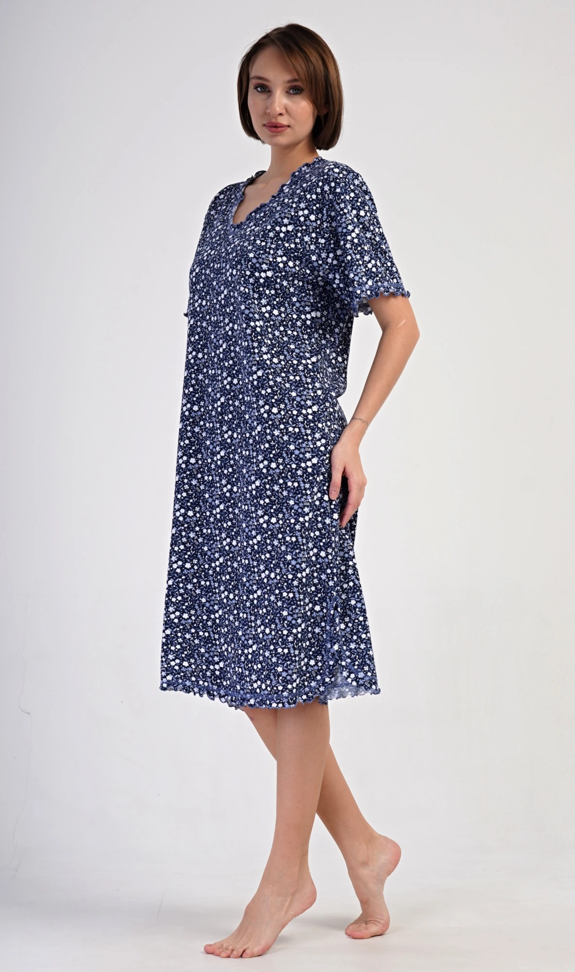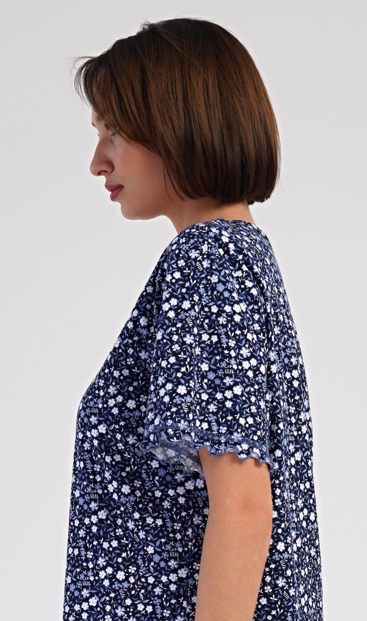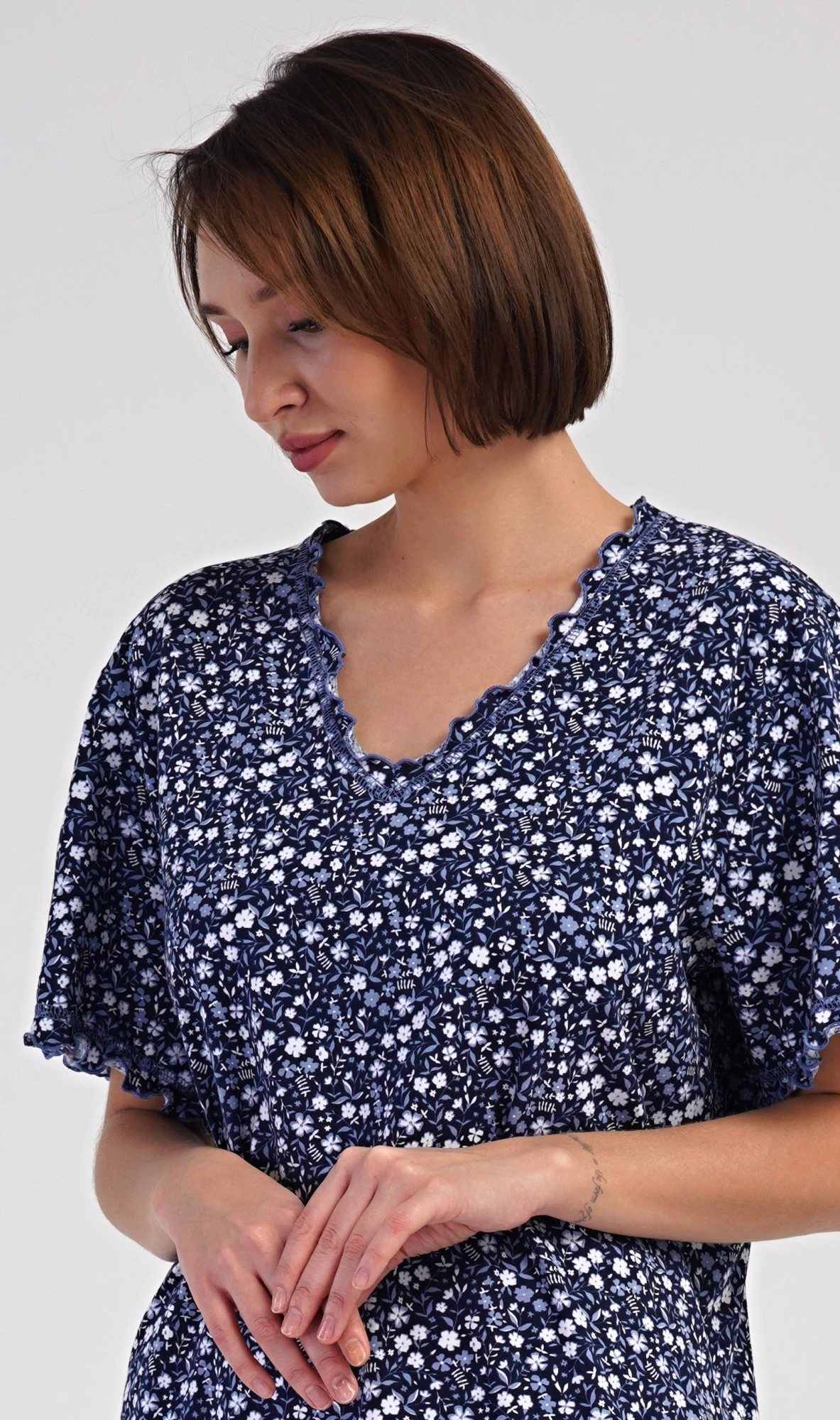 Dámská bavlněná noční košile s krátkým rukávem Miriam. Dámská noční košile má příjemnou délkou pod kolena a ozdobné žlábkování okolo výstřihu, rukávů a spodního lemu. Košile s krátkým rukávem je potištěna drobnými květy. Použitý materiál s podílem bavlny 100% je příjemný a poddajný na dotek.