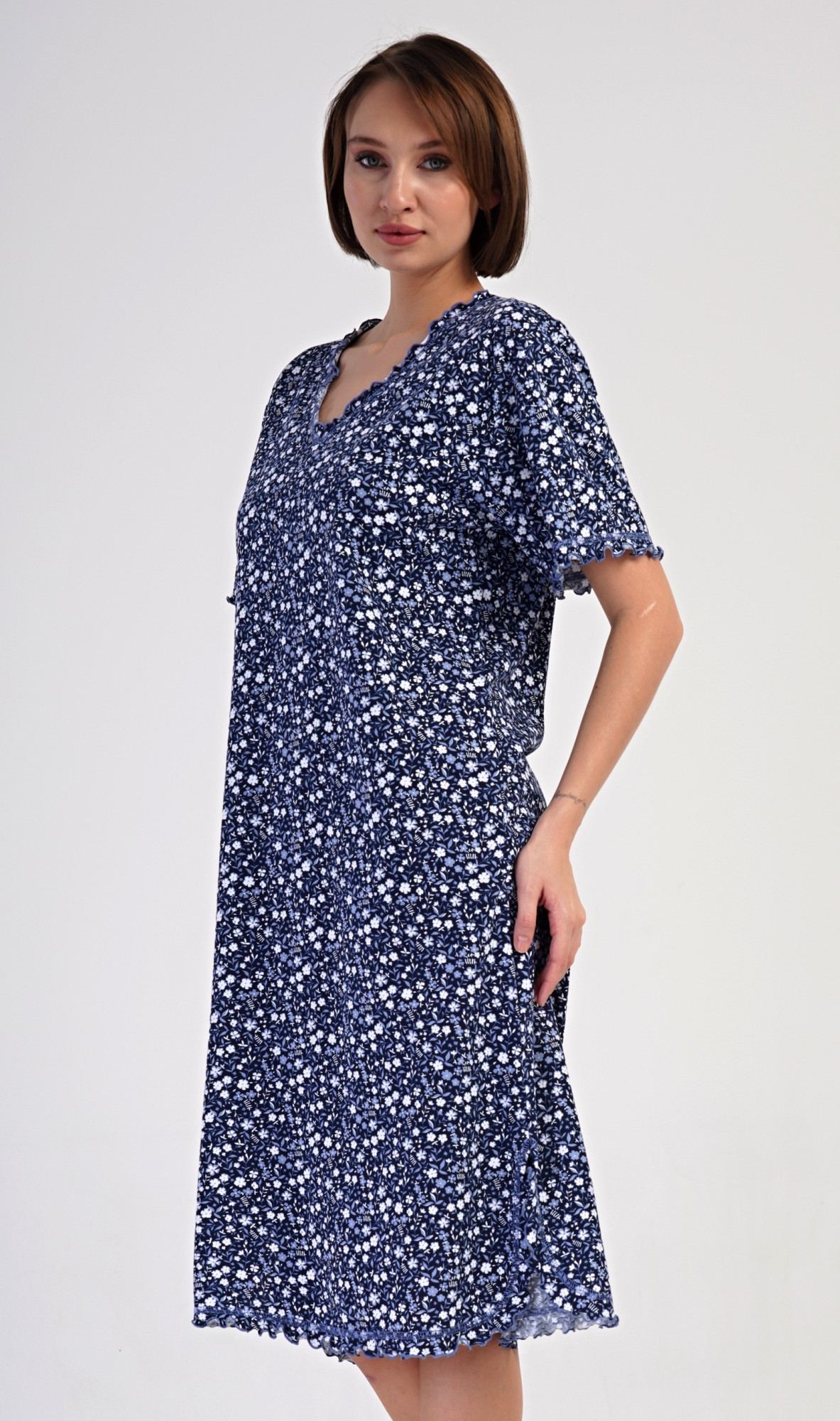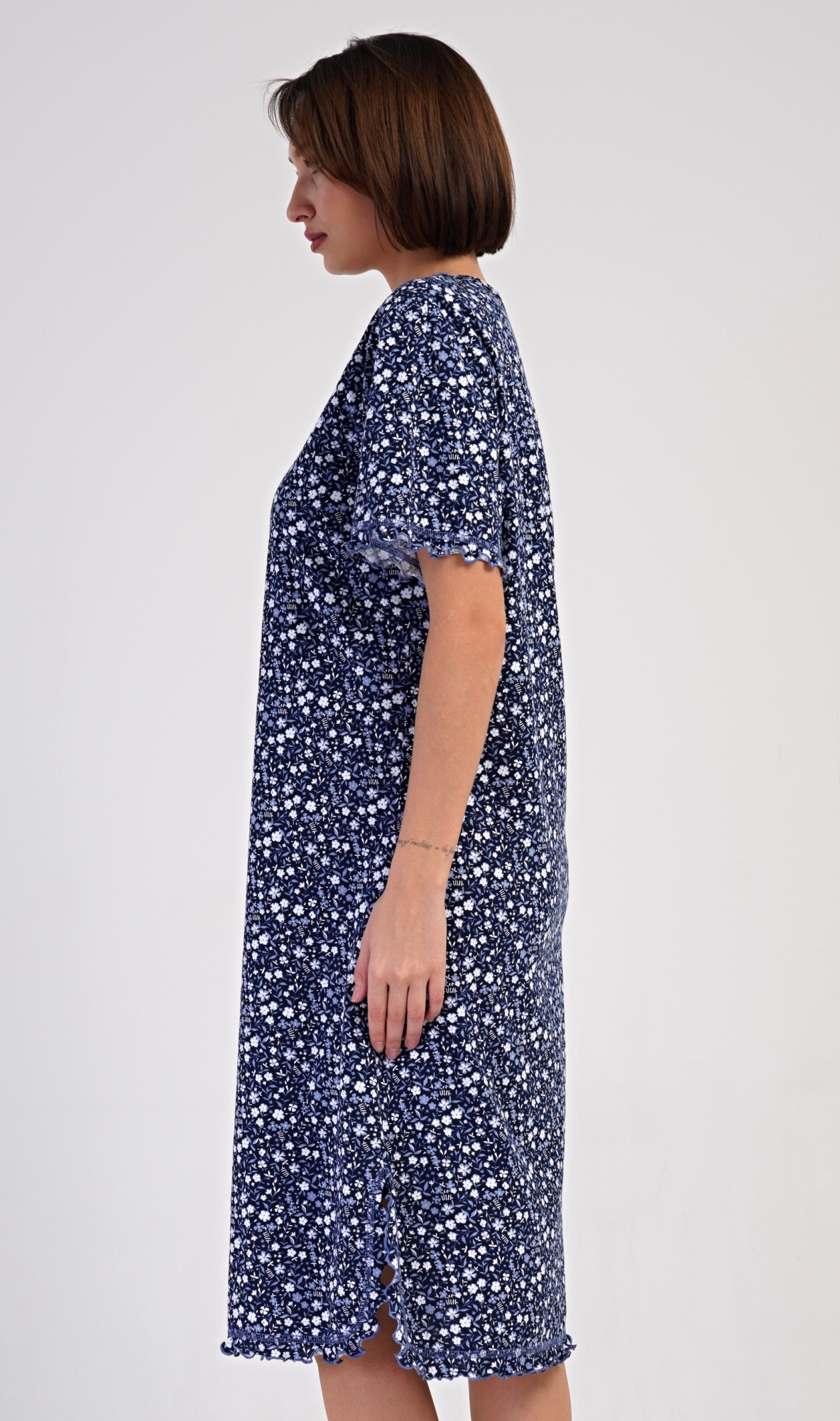 Dámská bavlněná noční košile s krátkým rukávem Miriam. Dámská noční košile má příjemnou délkou pod kolena a ozdobné žlábkování okolo výstřihu, rukávů a spodního lemu. Košile s krátkým rukávem je potištěna drobnými květy. Použitý materiál s podílem bavlny 100% je příjemný a poddajný na dotek.