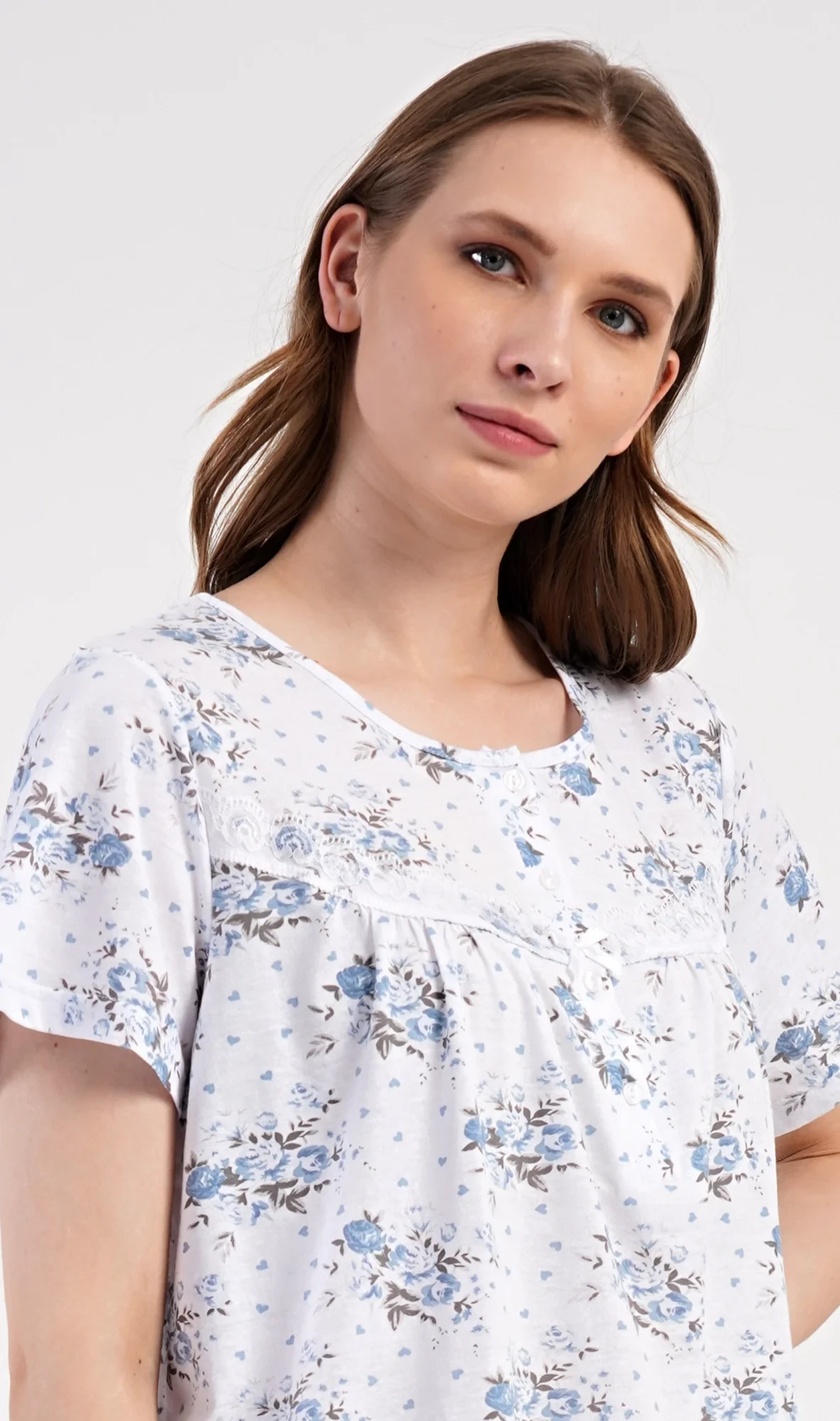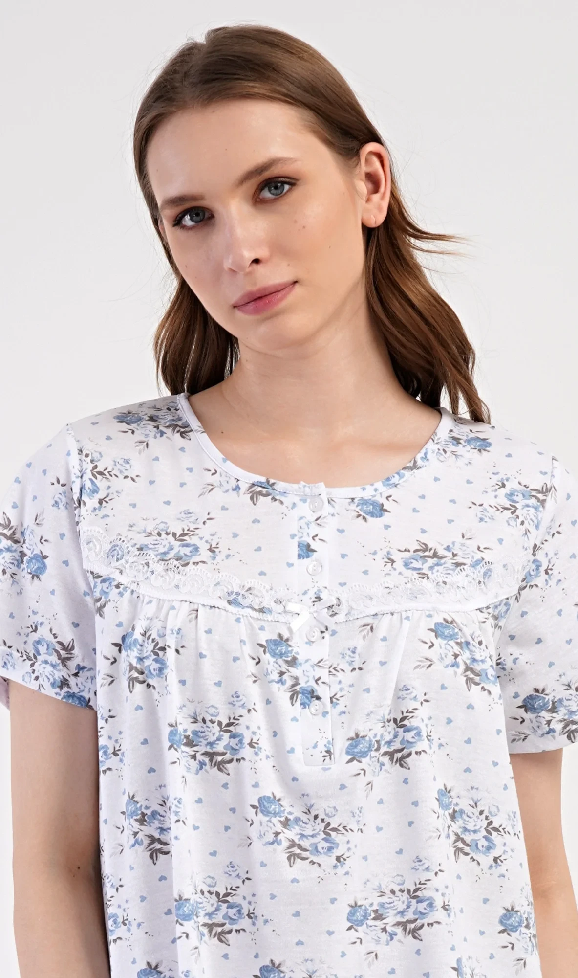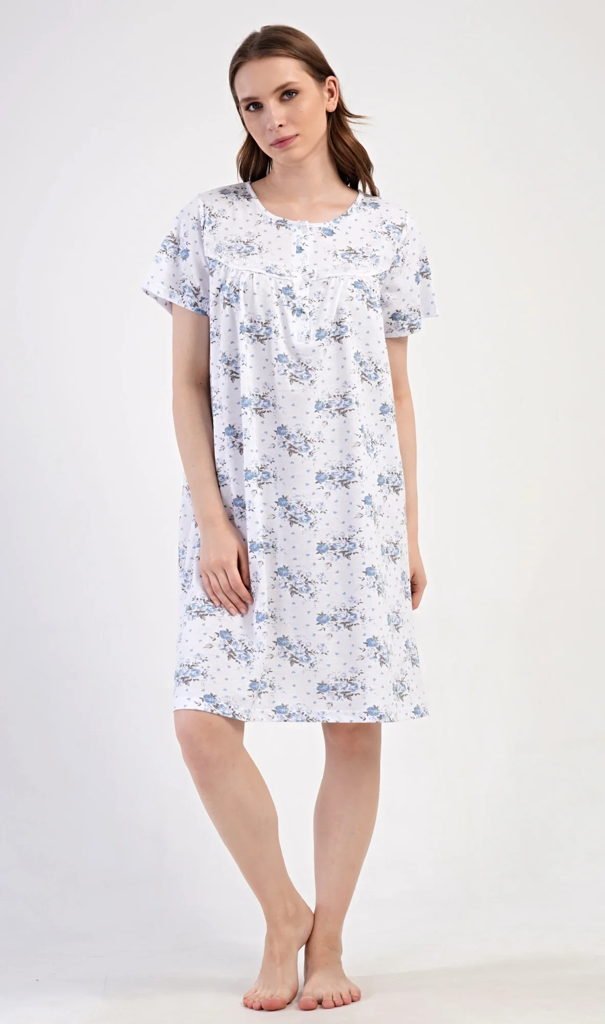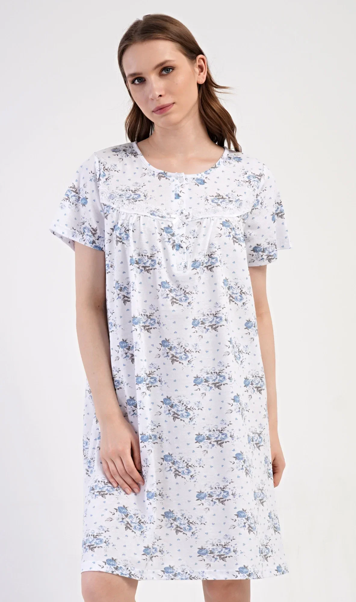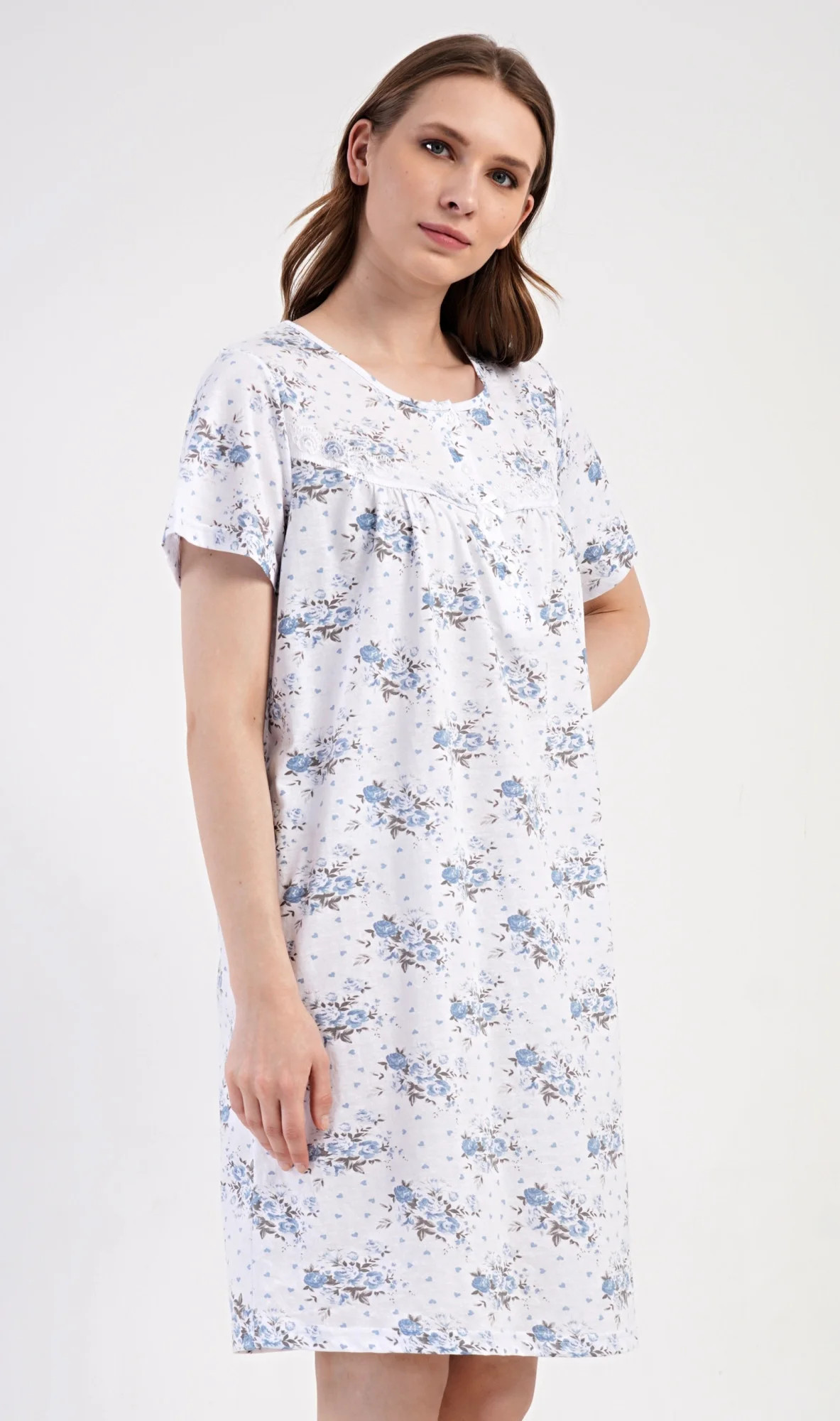 Dámská bavlněná noční košile s krátkým rukávem Julie. Dámská noční košile v příjemné délce po kolena má kulatý výstřih se zapínáním na knoflíky a ozdobnou krajku. Celá košile je potištěna květy. Použitý bavlněný materiál je příjemný a poddajný na dotek.