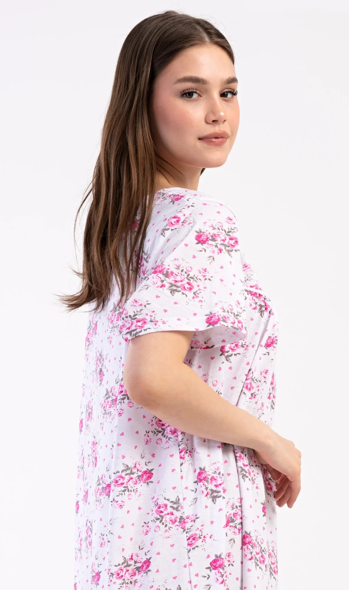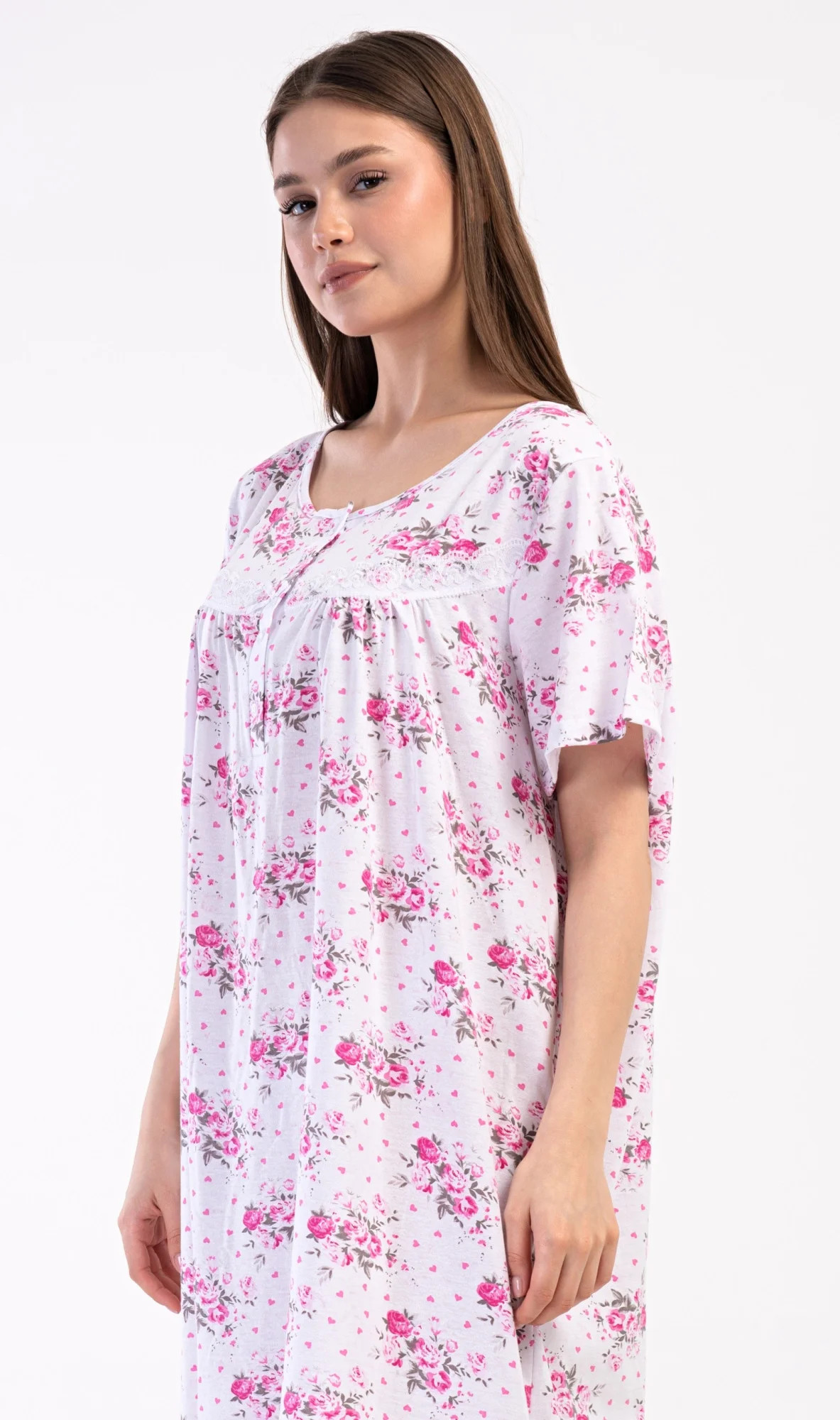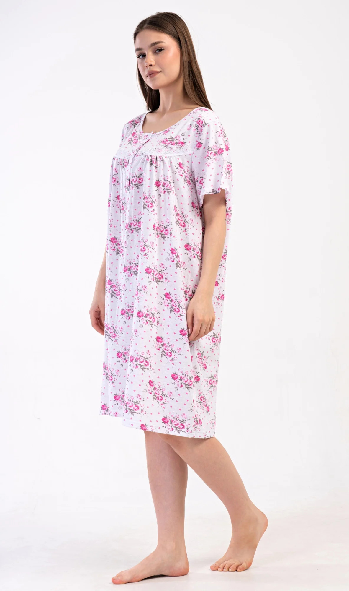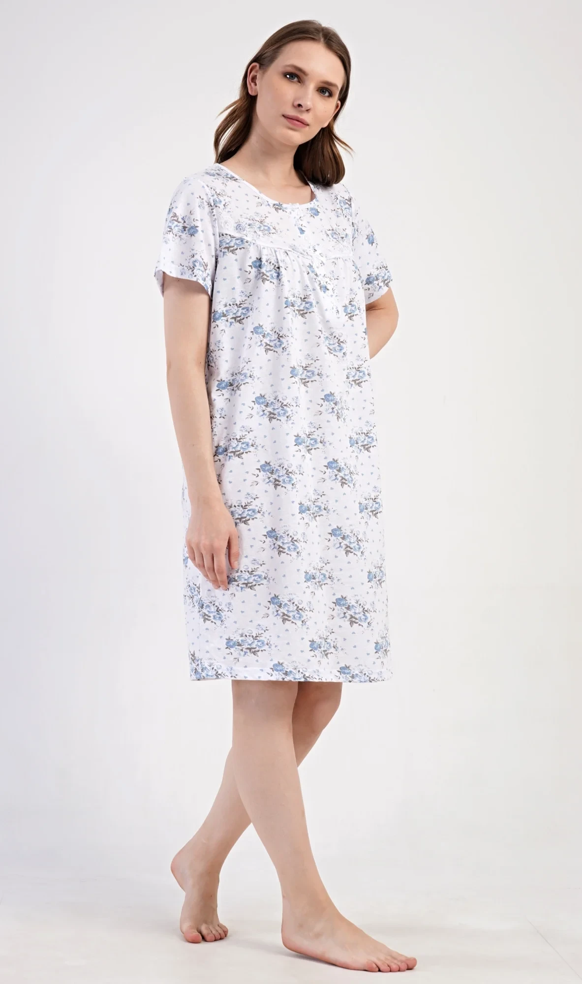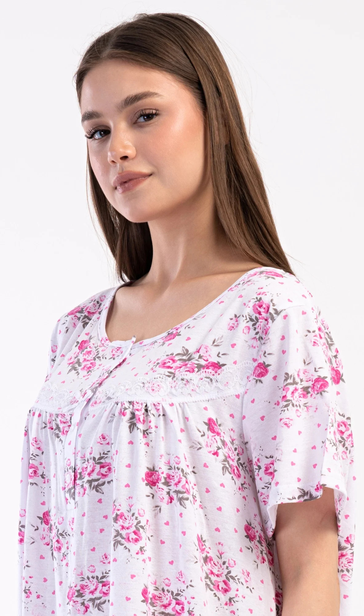 Dámská bavlněná noční košile s krátkým rukávem Julie. Dámská noční košile v příjemné délce po kolena má kulatý výstřih se zapínáním na knoflíky a ozdobnou krajku. Celá košile je potištěna květy. Použitý bavlněný materiál je příjemný a poddajný na dotek.