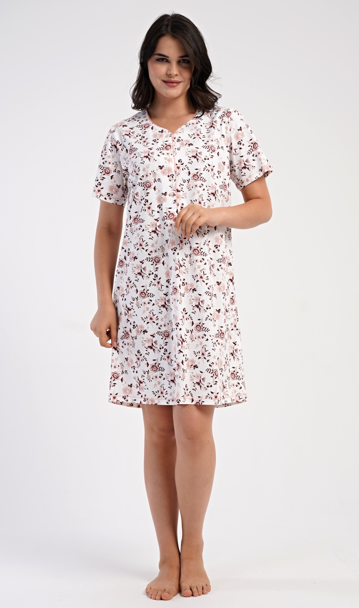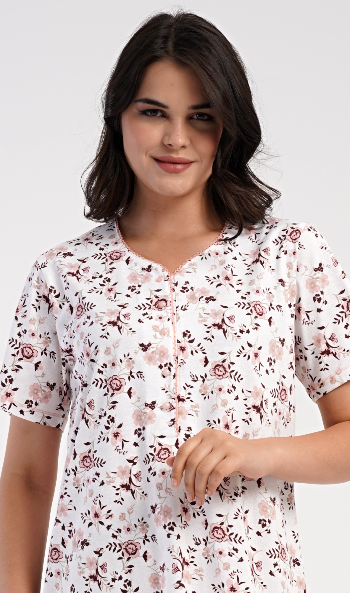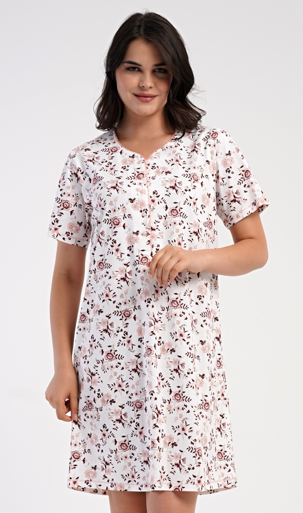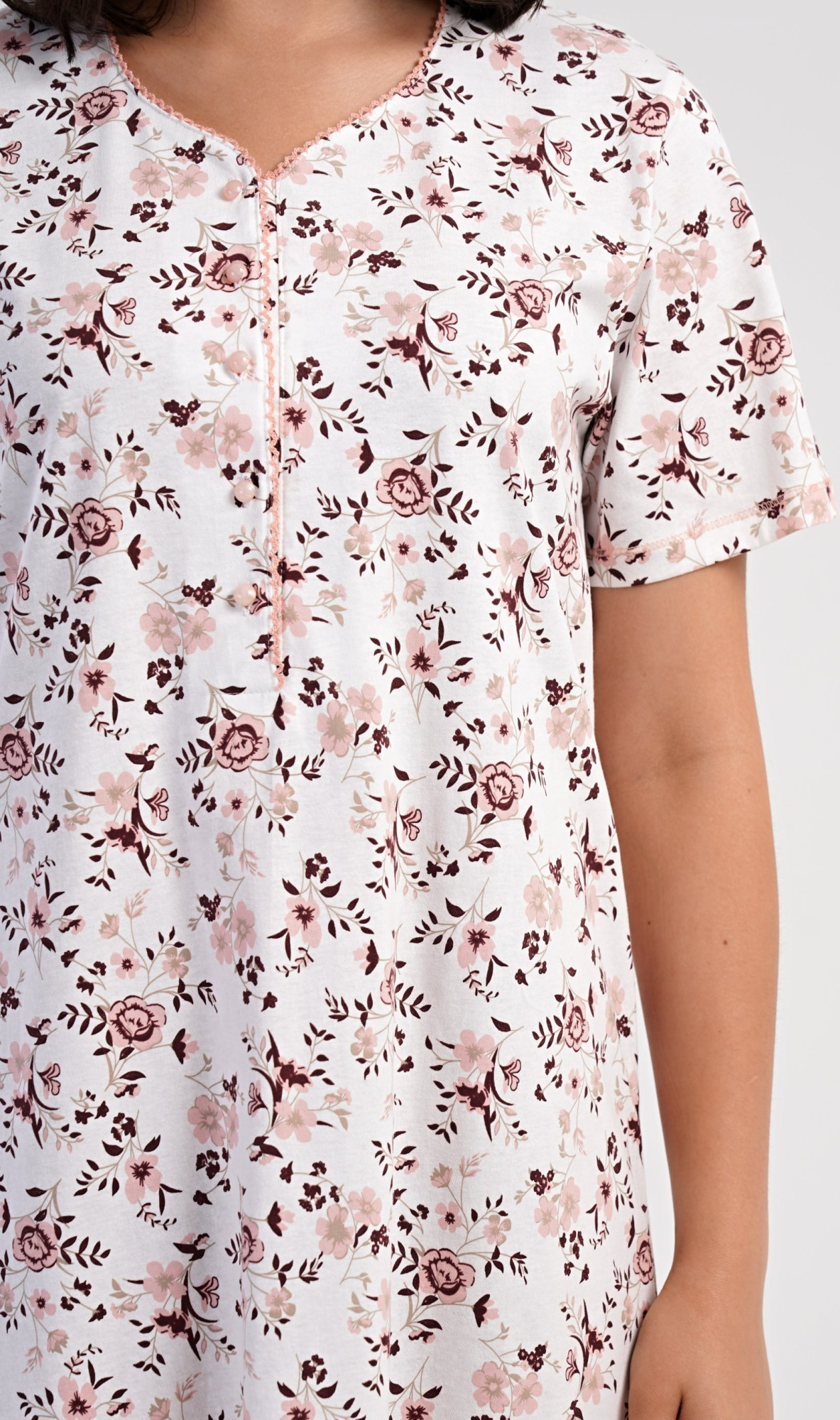 Dámská bavlněná noční košile s krátkým rukávem Růže. Dámská noční košile má příjemnou délkou po kolena a delší légu s pěti knoflíky. Košile s krátkým rukávem je potištěna růžemi v lososové barvě. Použitý materiál s podílem bavlny 100% je příjemný a poddajný na dotek.