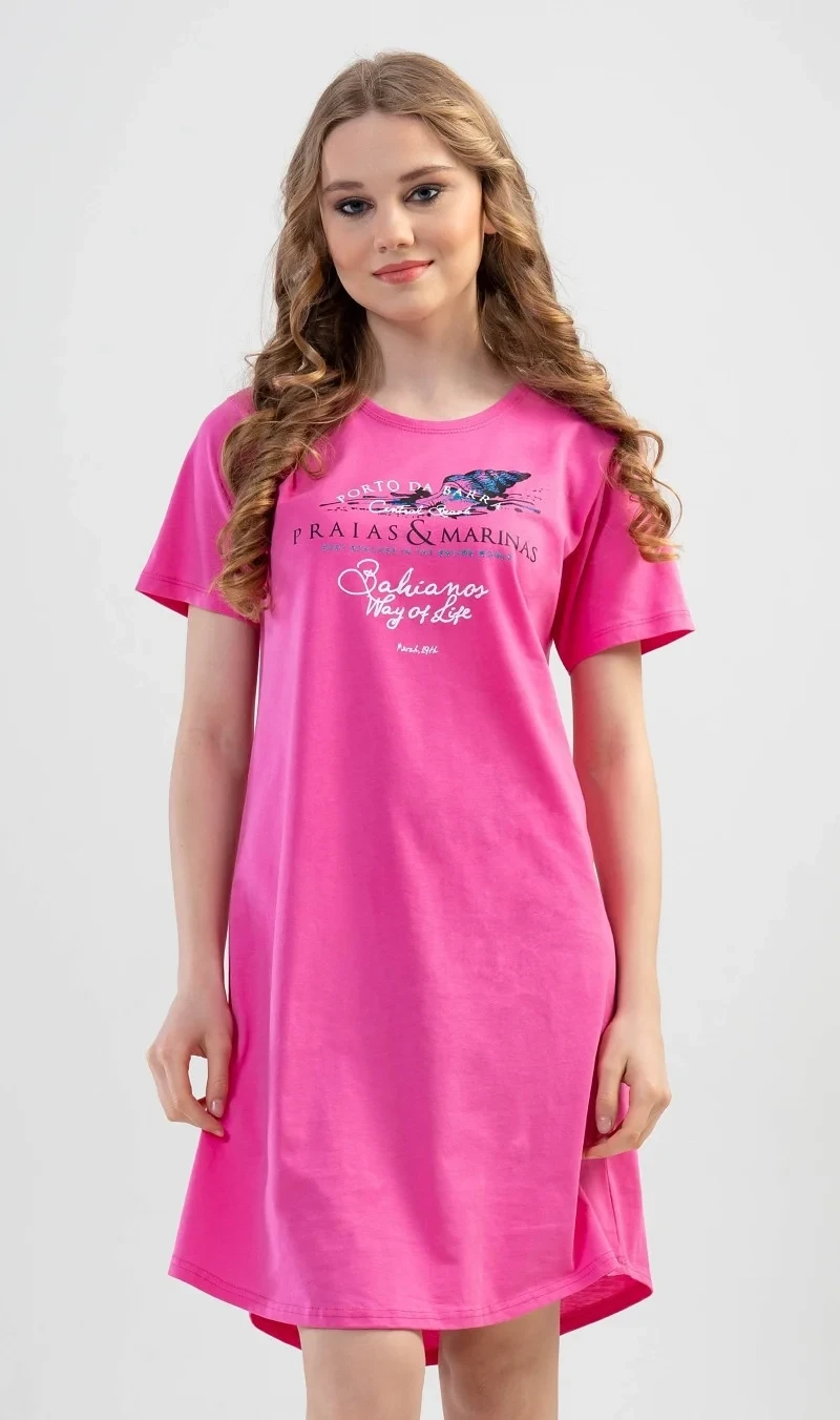 Dámská bavlněná noční košile s krátkým rukávem Moře. Noční košile s kulatým výstřihem je potištěna mořskými motivy a nápisem. Použitý bavlněný materiál je příjemný a poddajný na dotek.