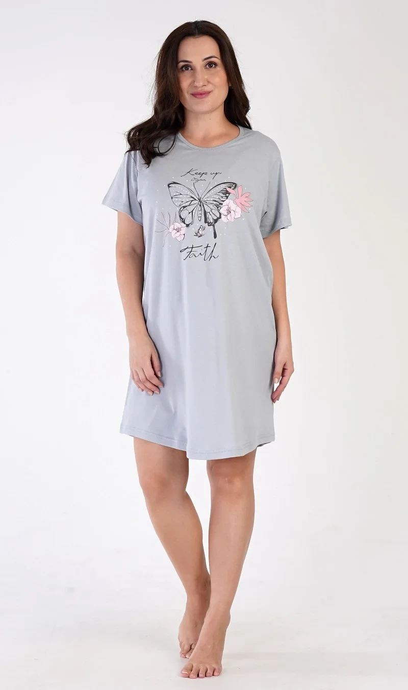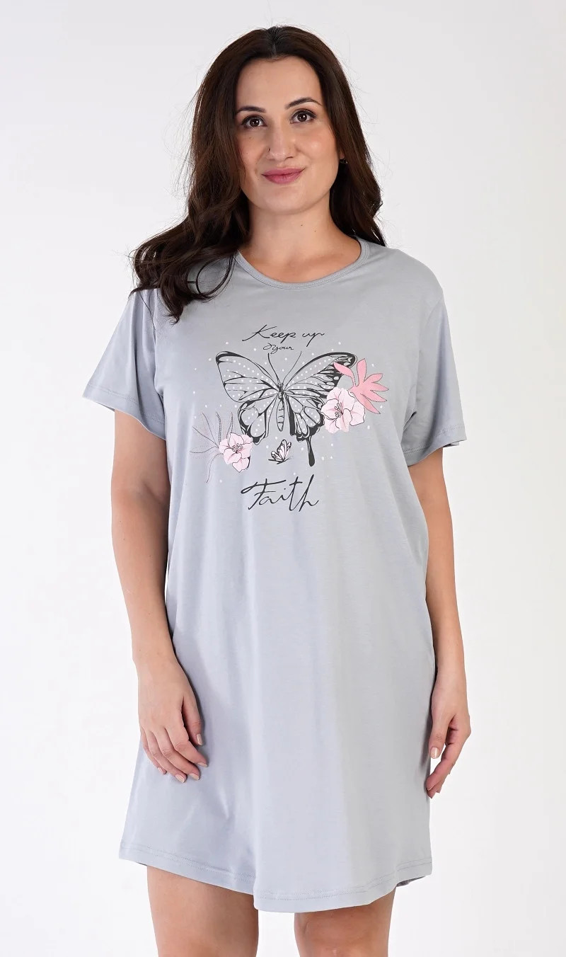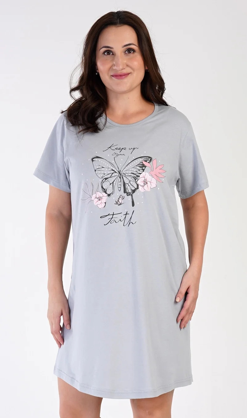 Dámská bavlněná noční košile s krátkým rukávem Motýl. Dámská noční košile s kulatým výstřihem je jednobarevná, na hrudi má nápis 'Keep up your faith' a obrázek motýla. Použitý materiál s obsahem bavlny 100% je příjemný a poddajný na dotek.