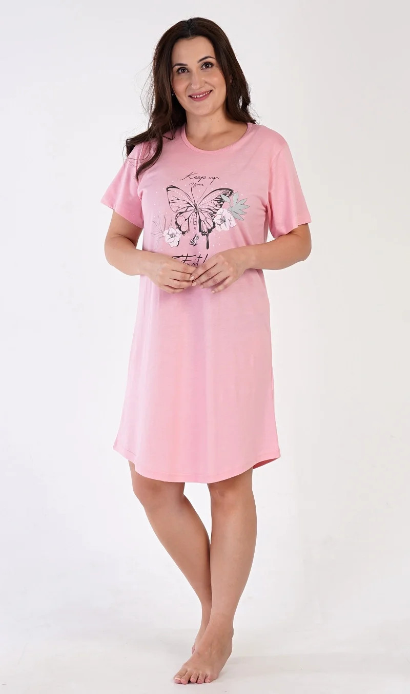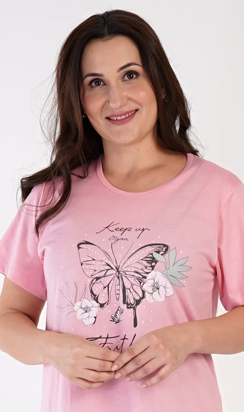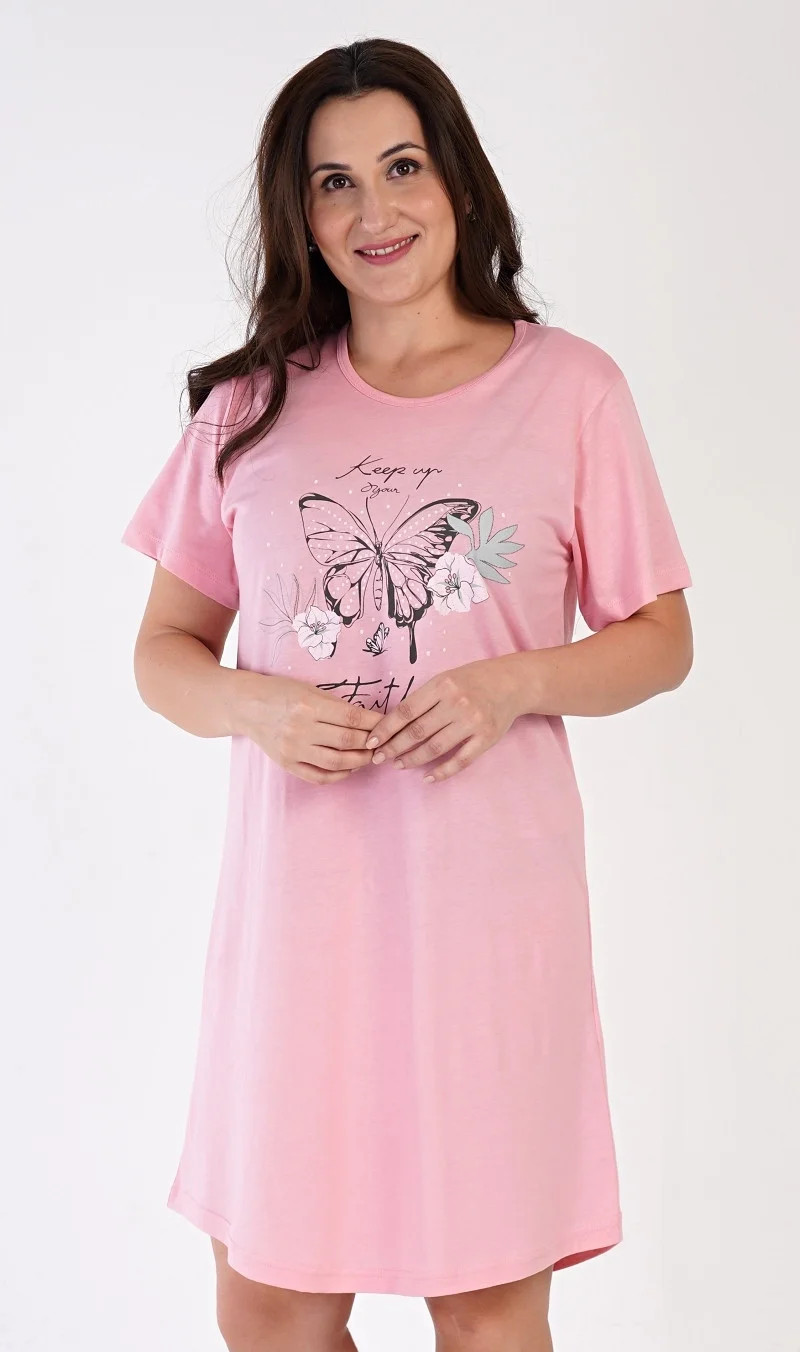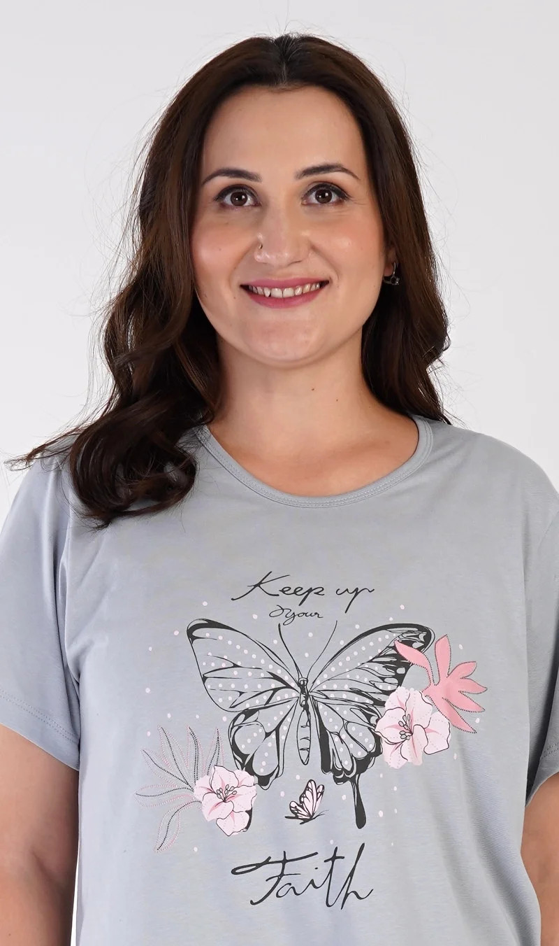 Dámská bavlněná noční košile s krátkým rukávem Motýl. Dámská noční košile s kulatým výstřihem je jednobarevná, na hrudi má nápis 'Keep up your faith' a obrázek motýla. Použitý materiál s obsahem bavlny 100% je příjemný a poddajný na dotek.
