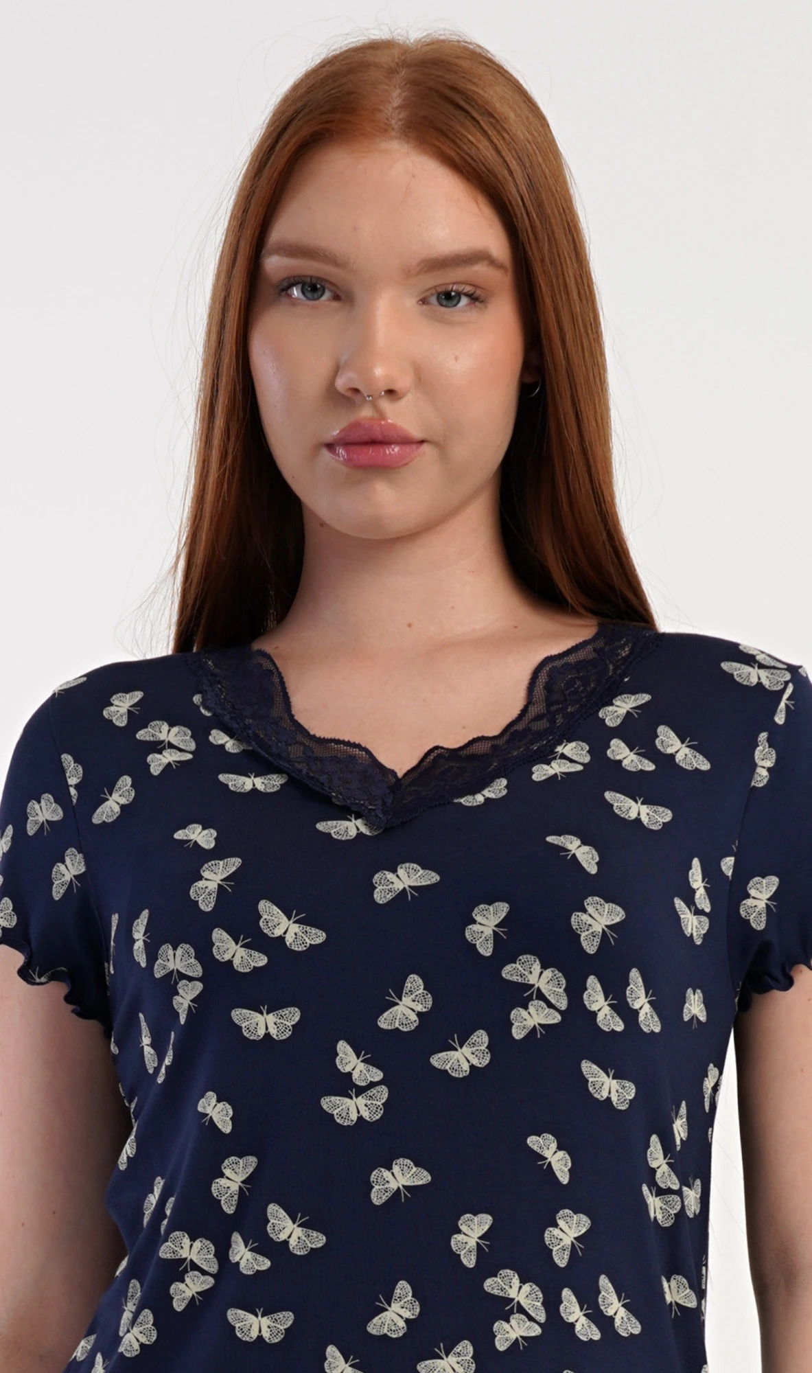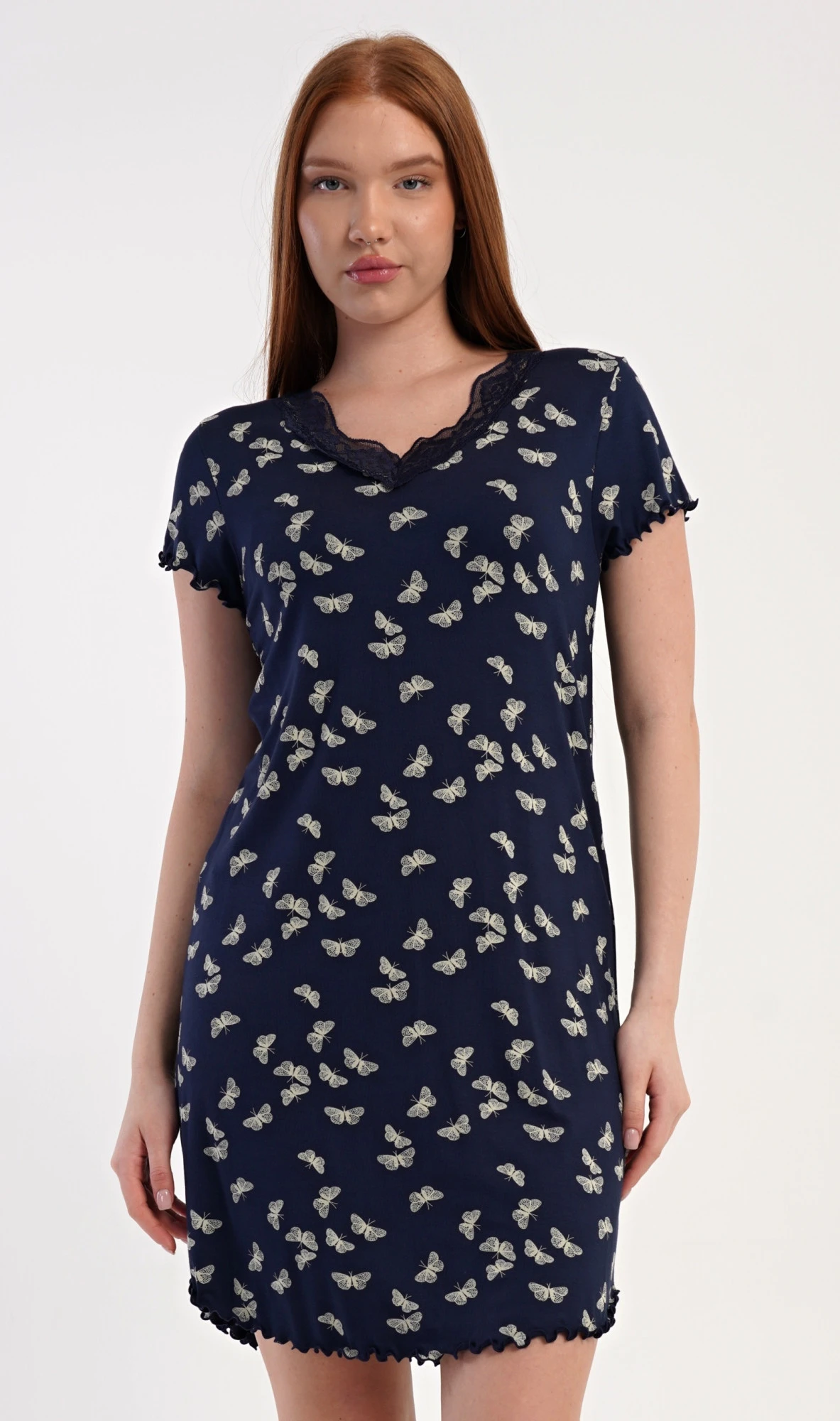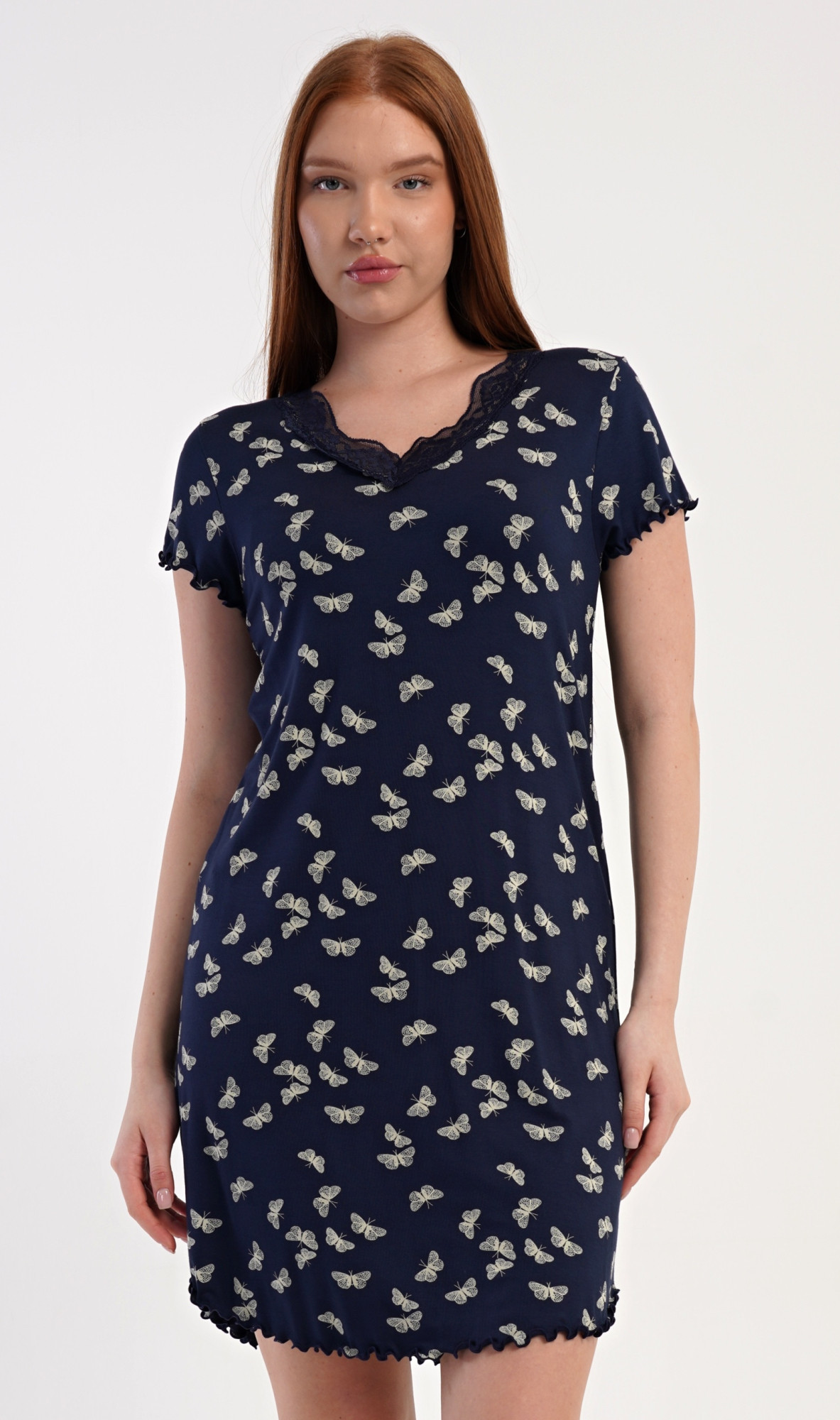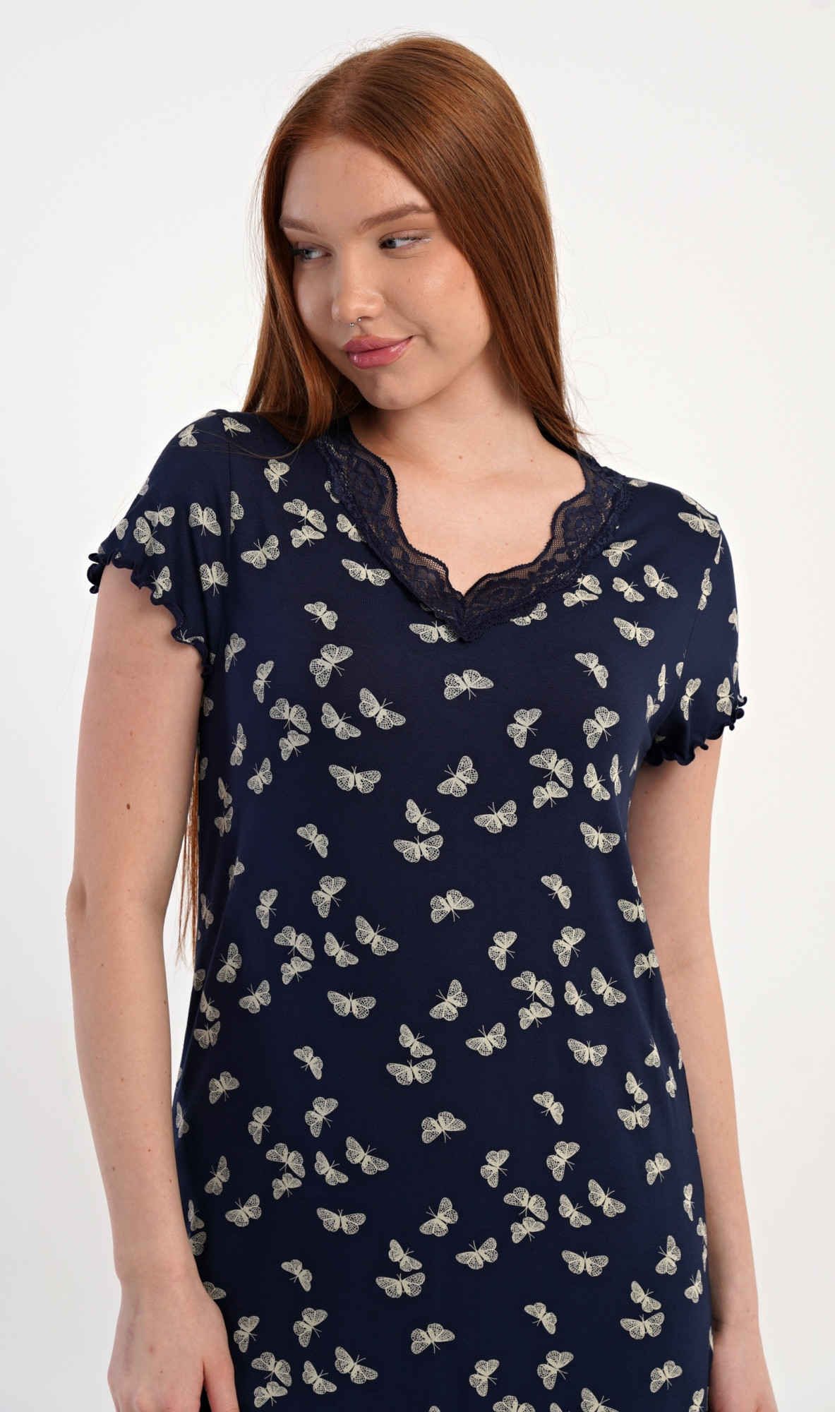 Dámská noční košile s krátkým rukávem Motýlci. Noční košile s příjemnou délkou po kolena má žlábkování na rukávech a spodním lemu, výstřih je ozdoben krajkou. Látka košile je potištěna drobnými motýlky. Použitý viskózový materiál s příměsí lycry je příjemný a poddajný na dotek.