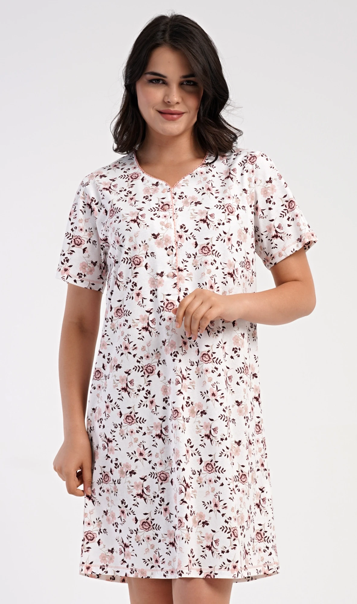 Dámská bavlněná noční košile s krátkým rukávem Růže. Dámská noční košile má příjemnou délkou po kolena a delší légu s pěti knoflíky. Košile s krátkým rukávem je potištěna růžemi v lososové barvě. Použitý materiál s podílem bavlny 100% je příjemný a poddajný na dotek.