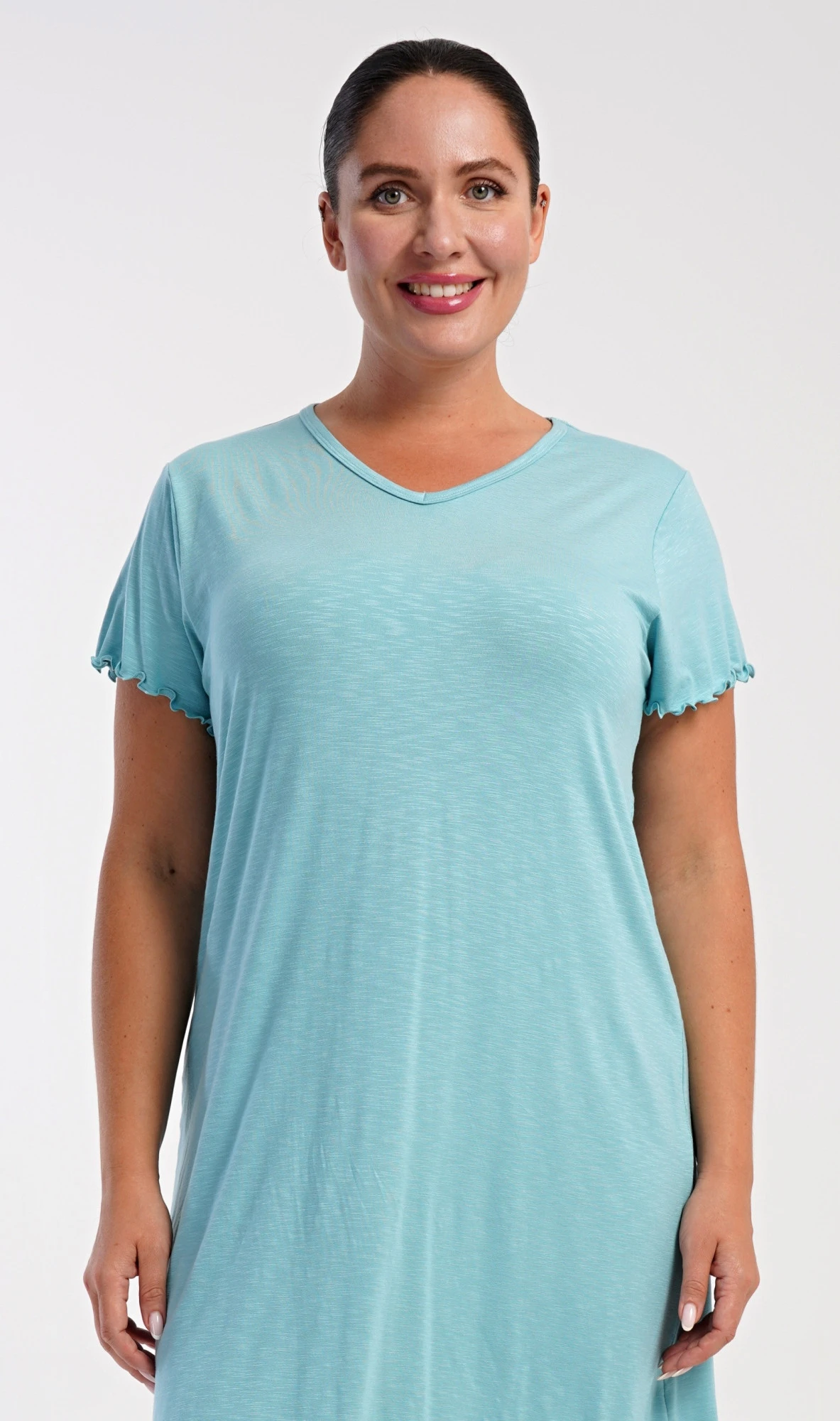 Dámská bavlněná noční košile s krátkým rukávem Sabrina. Košile má příjemnou délkou nad kolena a výstřih do V, je ozdobena žlábkováním na rukávech a spodním lemu. Použitý materiál s podílem bavlny 95% je příjemný a poddajný na dotek.