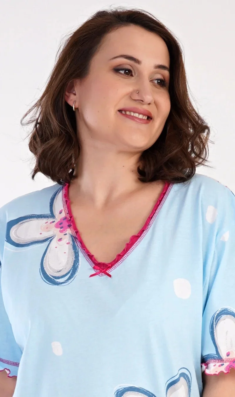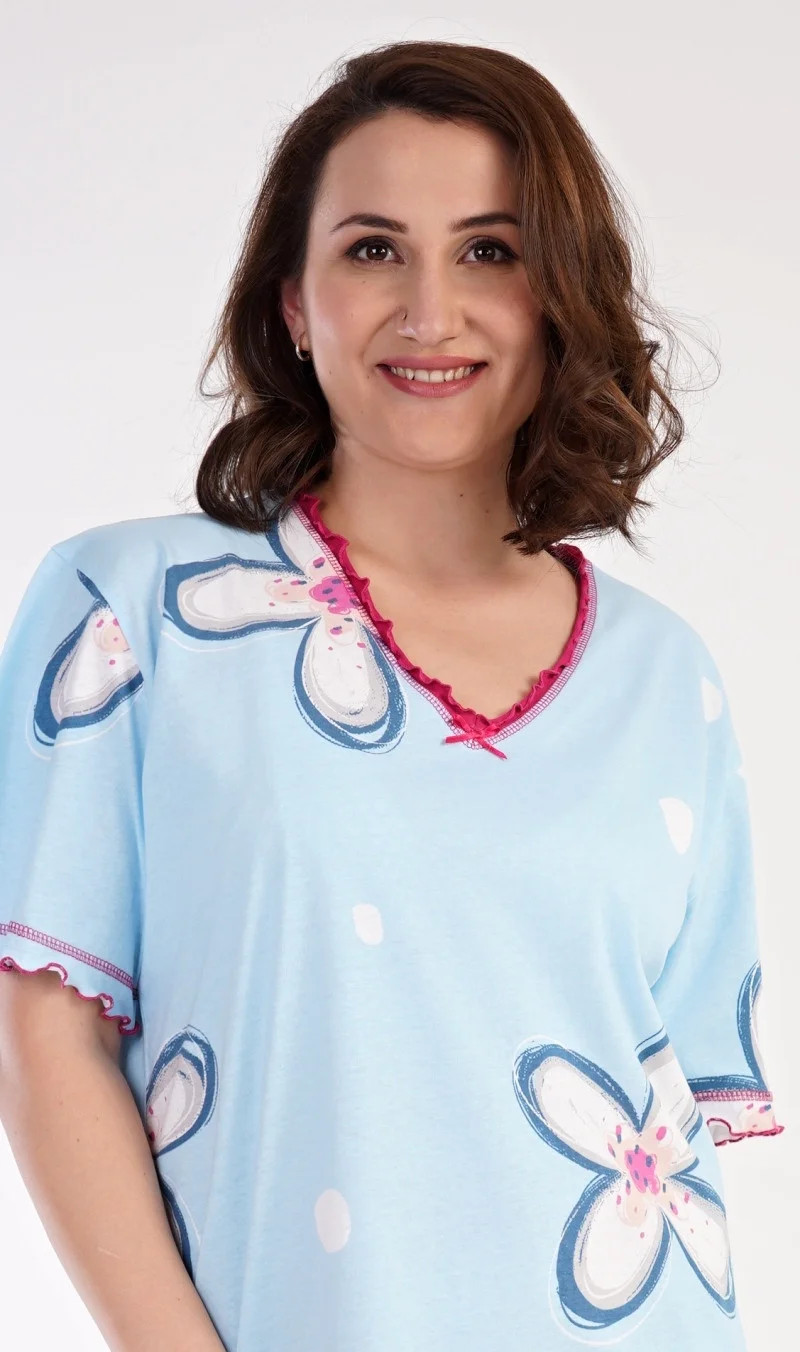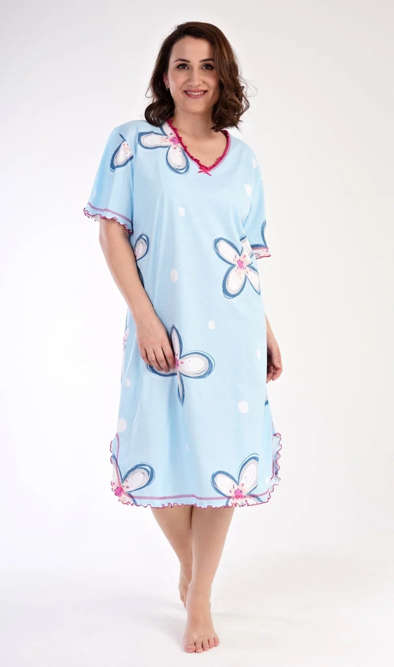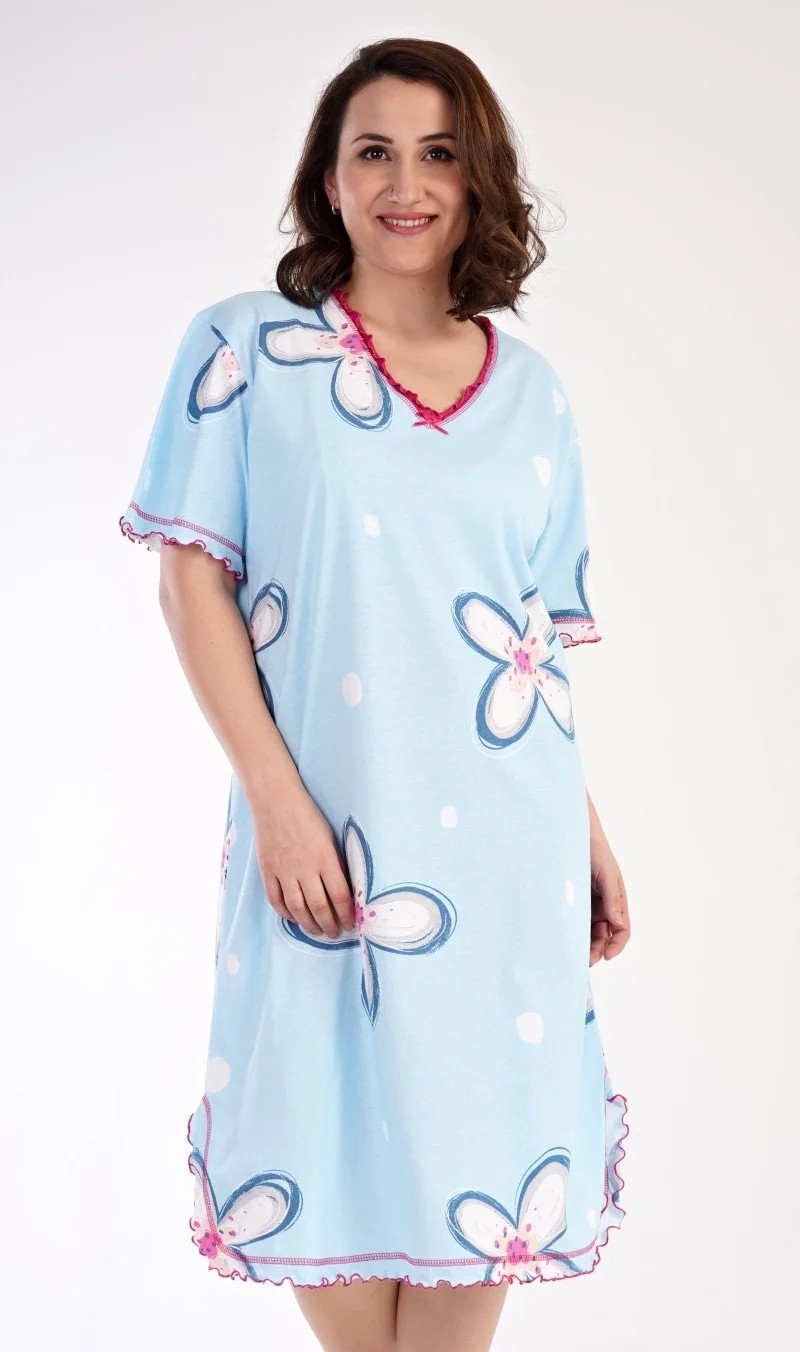 Dámská bavlněná noční košile s krátkým rukávem Veronika. Noční košile s příjemnou délkou pod kolena má ozdobné žlábkování kolem výstřihu, rukávů a spodního lemu, který je ozvláštněn rozparkem. Na látce košile jsou natištěny velké květy. Použitý bavlněný materiál je příjemný a poddajný na dotek.