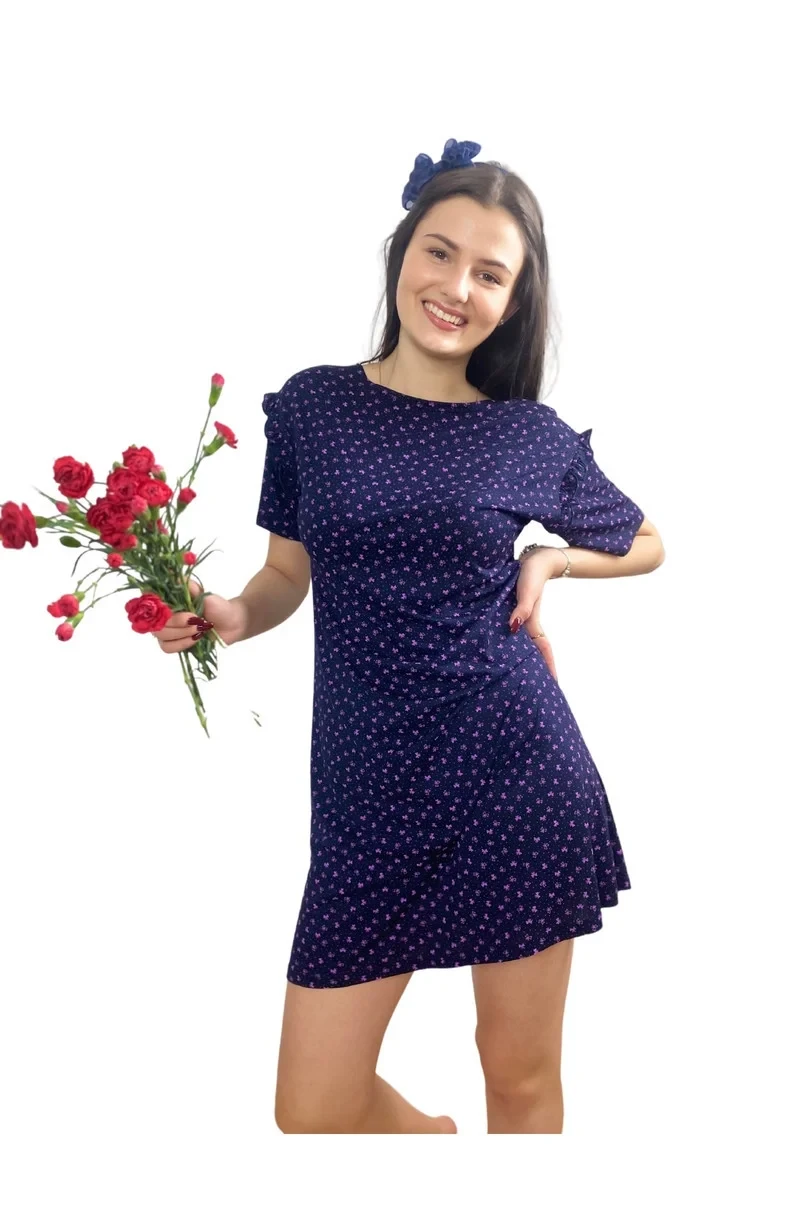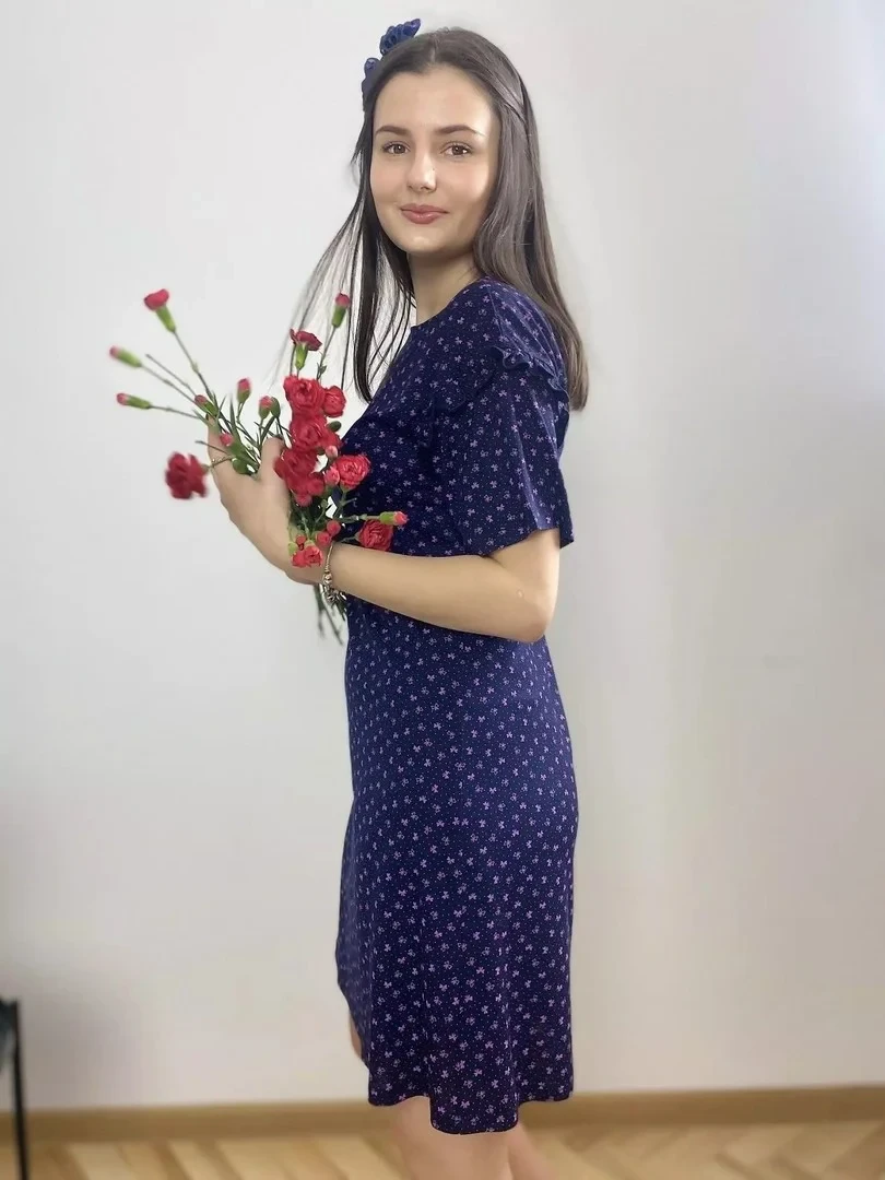 Košile má krátké rukávy, kulatý výstřih a délku nad kolena. Rukávy modelu zdobí volánek.