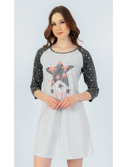 Dámská noční košile s tříčtvrtečním rukávem Hvězda. Dámská noní košilka má pohledově odlišené rukávy, které jsou potištěné drobnými hvězdičkami. Na hrudi je velká hvězda, která má v sobě menší hvězdičky a je ještě dalšími hvězdami obklopena. Pod hvězdou je stříbřitý nápis. Použitý materiál je jemný a poddaný na dotek. Košile je vhodná i na denní nošení.