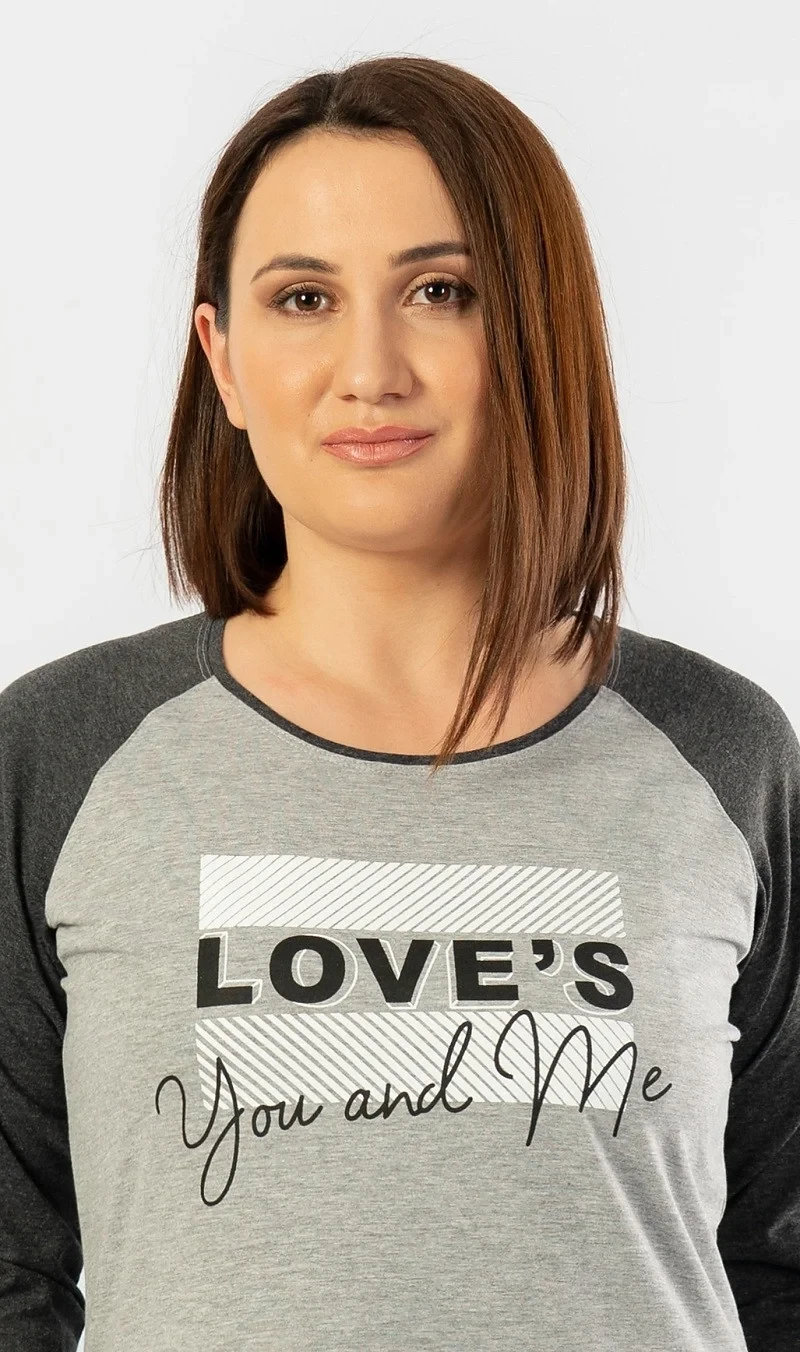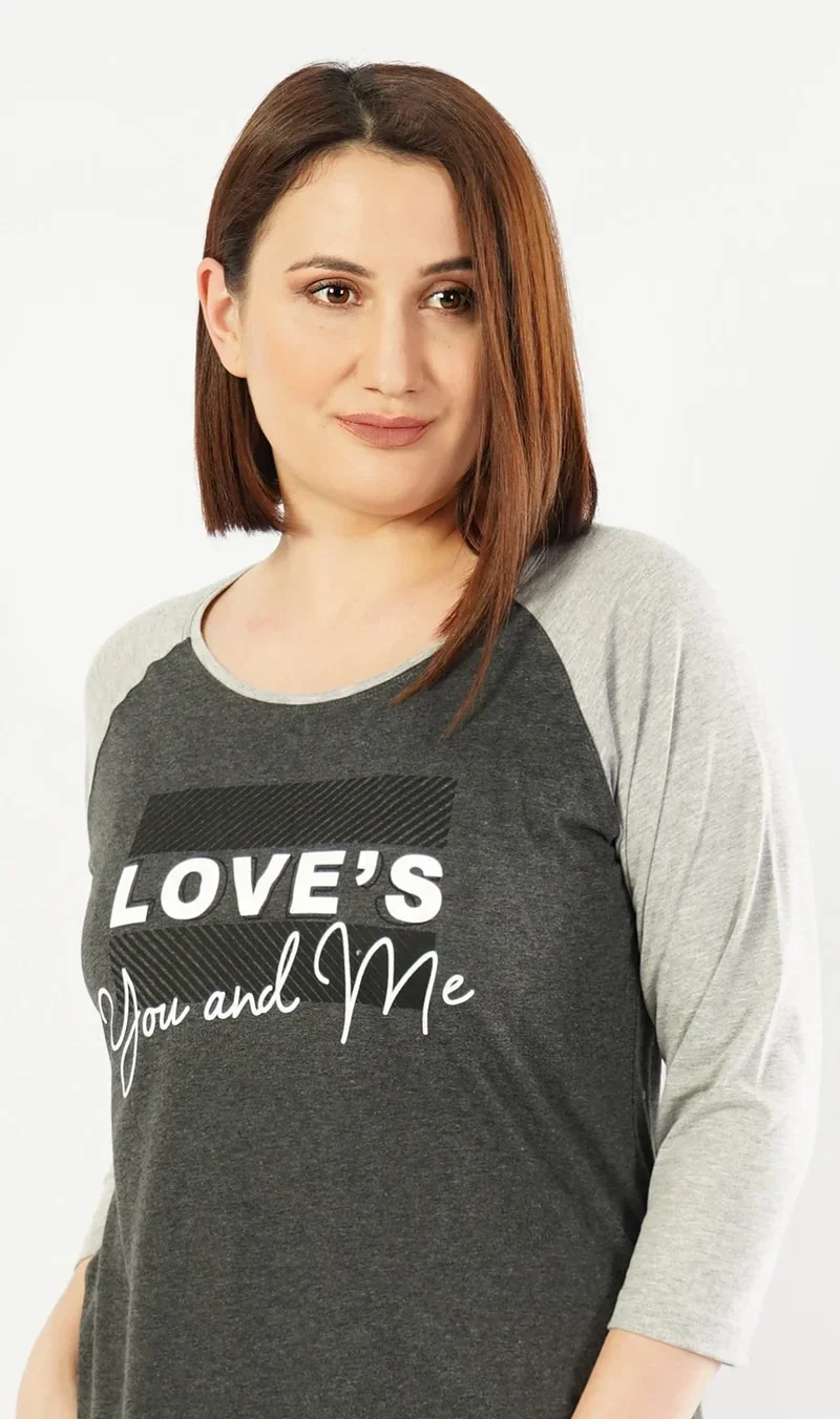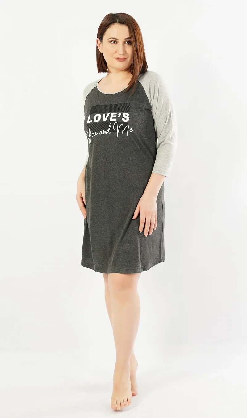 Dámská noční košile s tříčvrtečním rukávem You and me. Dámská noční košilka má pohledově barevně odlišené rukávy, na hrudi je nápis Love is You and me. Použitý materiál je jemný a poddajný na dotek. Košile je vhodná i na denní nošení.