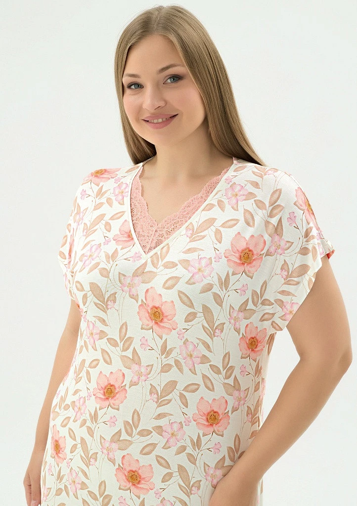 Dámská noční košile s jemným květinovým designem je ideální volbou pro pohodlný spánek i chvíle odpočinku. Volnější střih se spadlými krátkými rukávy zajišťuje maximální komfort a příjemnou volnost pohybu během celé noci. Výstřih do V je ozdobený elegantní krajkou, která dodává košili něžný a romantický vzhled. Délka do poloviny lýtek působí vzdušně a zároveň poskytuje dostatek pohodlí. Díky lehkému a příjemnému materiálu se košile skvěle nosí a je ideální pro každodenní použití i klidné večery doma.