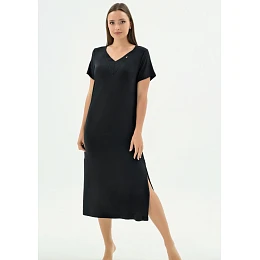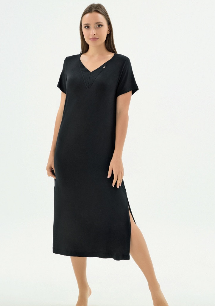 Elegantní dlouhá noční košile značky Sevim v černém provedení je ideální volbou pro ženy, které hledají maximální pohodlí v kombinaci s nadčasovým stylem. Košile je vyrobena z kvalitního mikromodalu, který je mimořádně jemný, prodyšný a příjemný na dotek. Materiál se krásně přizpůsobí postavě a zajistí komfort po celou noc. Model má výstřih do V, který opticky prodlužuje krk a dodává celkovému vzhledu ženskou eleganci. Dlouhý střih poskytuje dostatek pohodlí i při chladnějších nocích a zároveň působí velmi vkusně a upraveně. Na boku košile je rozparek pro pohodlnou chůzi.