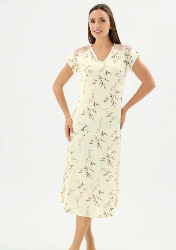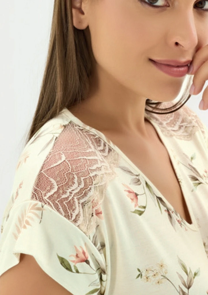 Dámská dlouhá noční košile kombinuje pohodlí s jemnými ženskými detaily. Výstřih do V opticky prodlužuje siluetu a působí elegantně, zatímco krátké rukávy poskytují volnost a pohodlí během spánku. Ramenou zdobí jemná krajka, která dodává košili něžný a romantický vzhled. Lehký a příjemný materiál se dokonale přizpůsobí postavě a zajistí maximální komfort po celou noc.