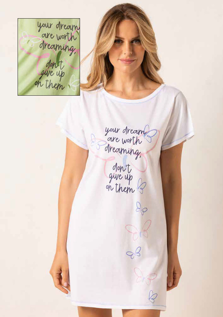 Noční košilka značky Siélei v jemném světle zeleném odstínu je ideální volbou pro pohodlný spánek i domácí relax. Lehký a příjemný materiál se krásně přizpůsobí postavě a zajišťuje maximální komfort po celou noc. Košilka má krátké rukávy a jednoduchý, volnější střih, který neomezuje v pohybu. Přední část zdobí něžný potisk s motýlky a motivujícím nápisem, který dodává modelu romantický a ženský vzhled. Díky své jemné barvě a pohodlnému provedení je tato noční košilka skvělou volbou pro ženy, které hledají kombinaci stylu a pohodlí. Model nabízíme v našem e-shopu pouze ve světle zelené barvě.