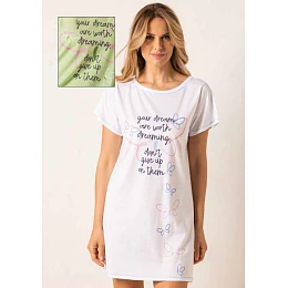 Noční košilka značky Siélei v jemném světle zeleném odstínu je ideální volbou pro pohodlný spánek i domácí relax. Lehký a příjemný materiál se krásně přizpůsobí postavě a zajišťuje maximální komfort po celou noc. Košilka má krátké rukávy a jednoduchý, volnější střih, který neomezuje v pohybu. Přední část zdobí něžný potisk s motýlky a motivujícím nápisem, který dodává modelu romantický a ženský vzhled. Díky své jemné barvě a pohodlnému provedení je tato noční košilka skvělou volbou pro ženy, které hledají kombinaci stylu a pohodlí. Model nabízíme v našem e-shopu pouze ve světle zelené barvě.