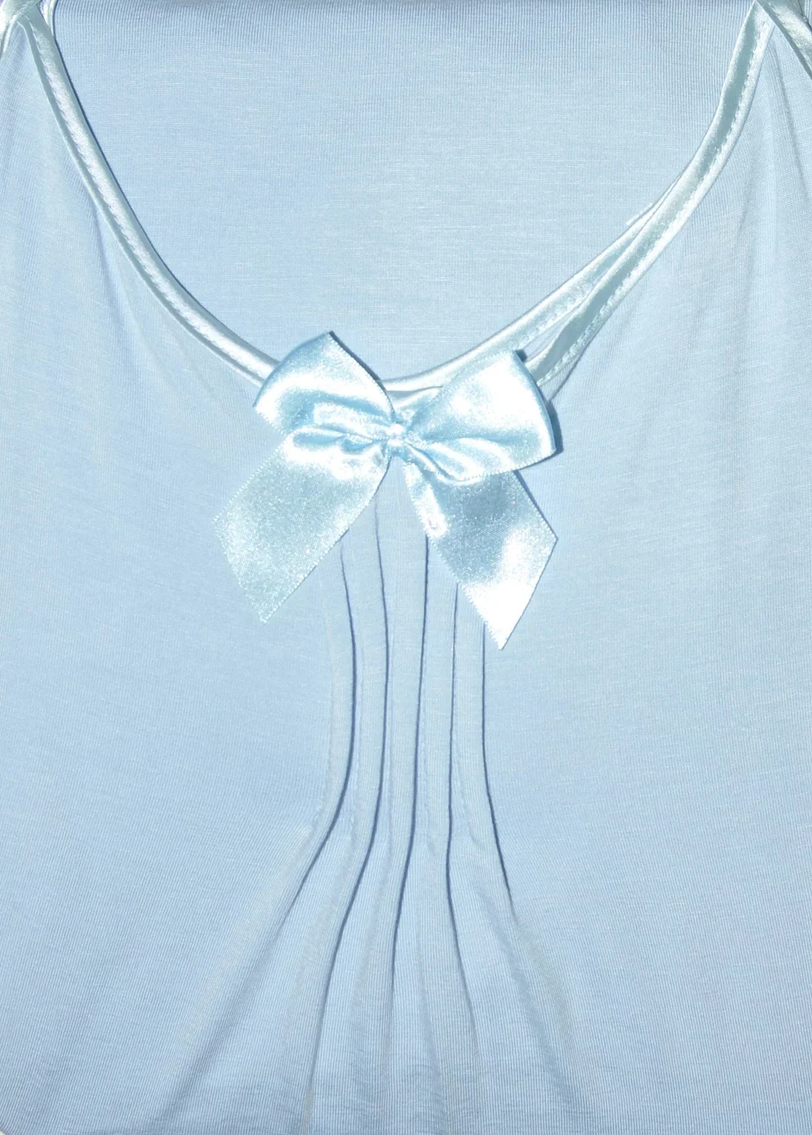 Model má úzká saténová ramínka, jejichž délku je možné nastavit. Výstřih modelu je ozdobený mašličkou a jemným nařasením.