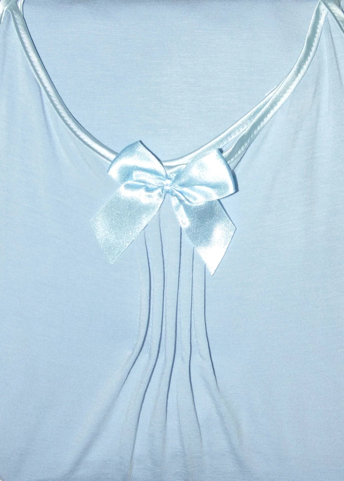 Model má úzká saténová ramínka, jejichž délku je možné nastavit. Výstřih modelu je ozdobený mašličkou a jemným nařasením.