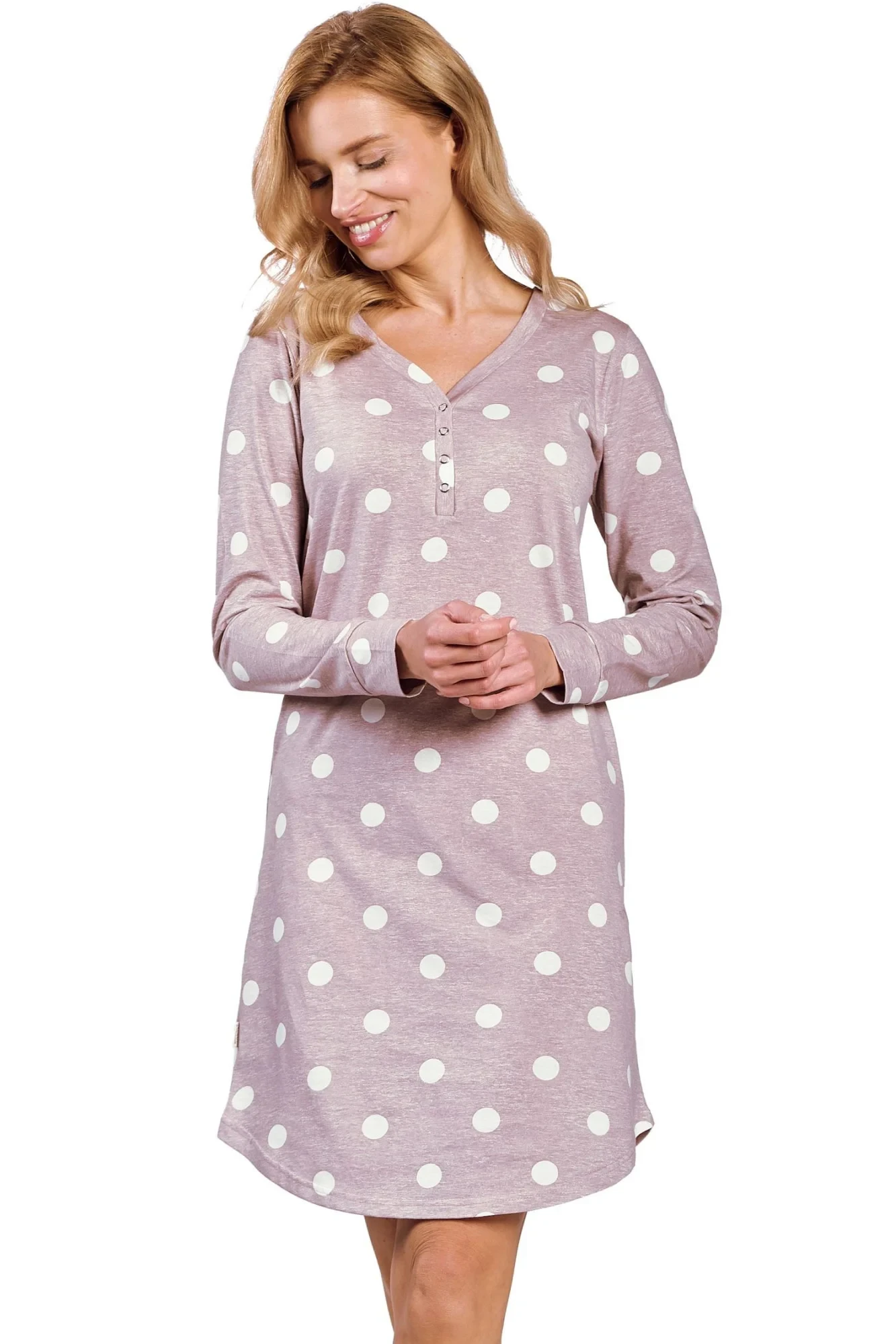 Dámská noční košilka 3215 01 Libby TARO - béžová barva - z vysoce jakostní bavlny - se vzorem bílých puntíků - dlouhé rukávy - výstřih se zapínáním na patentky - lemy rukávů a spodní části zakončené jemným řasením