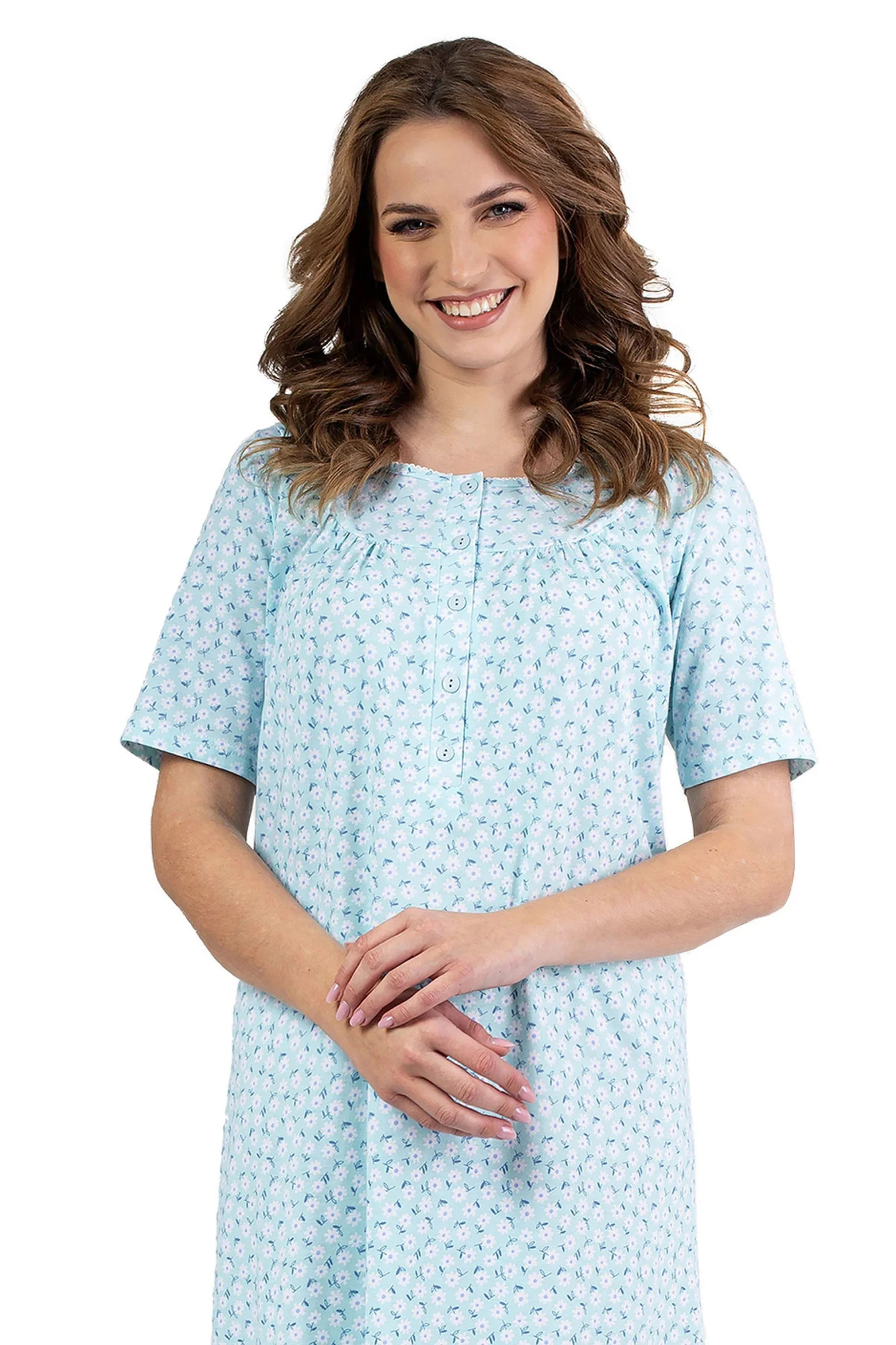 Dámská noční košilka 013 green REGINA - zelená barva - z vysoce jakostní bavlny - se vzorem - kulatý výstřih - krátké rukávy - zapínání na knoflíky