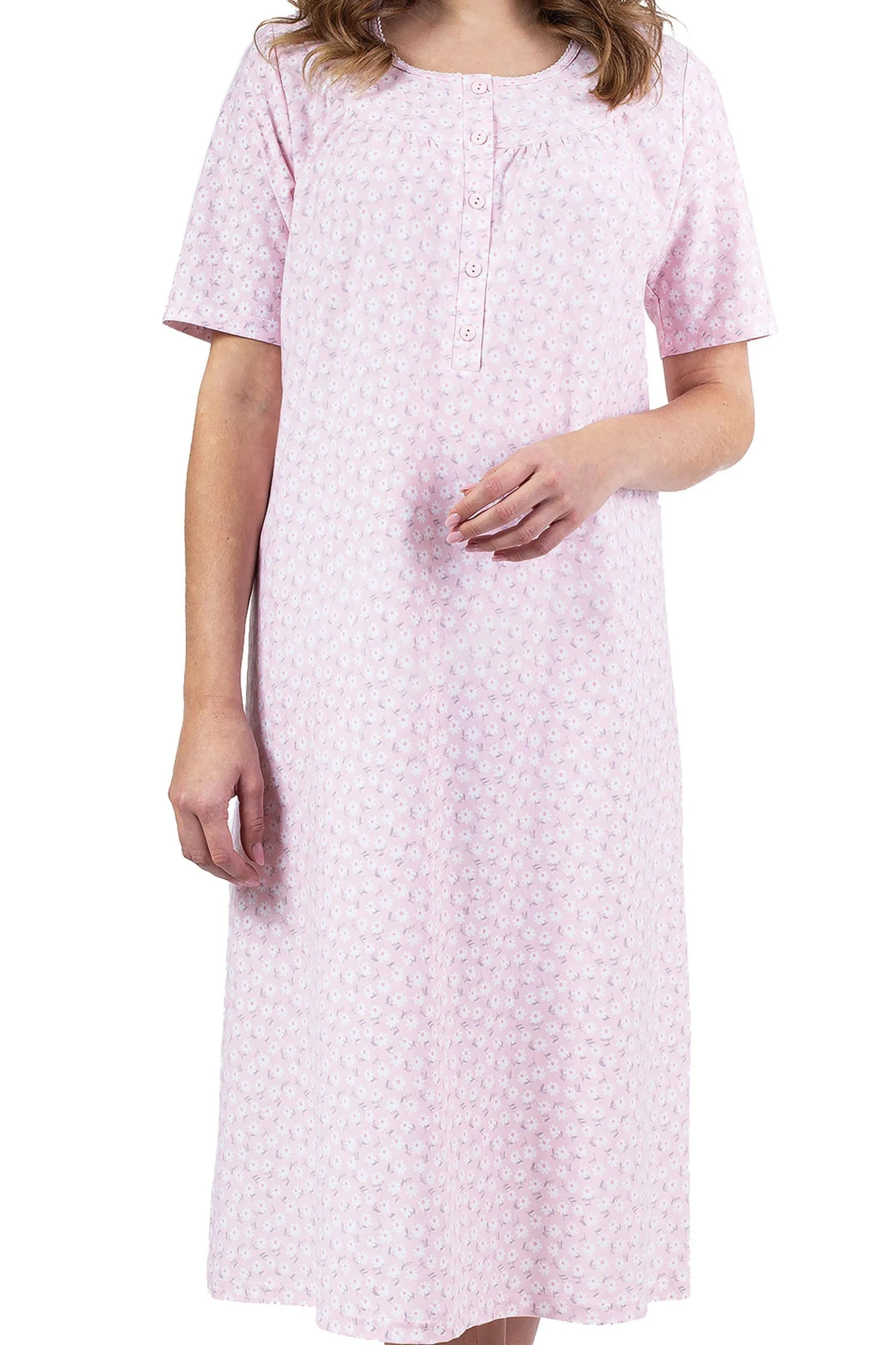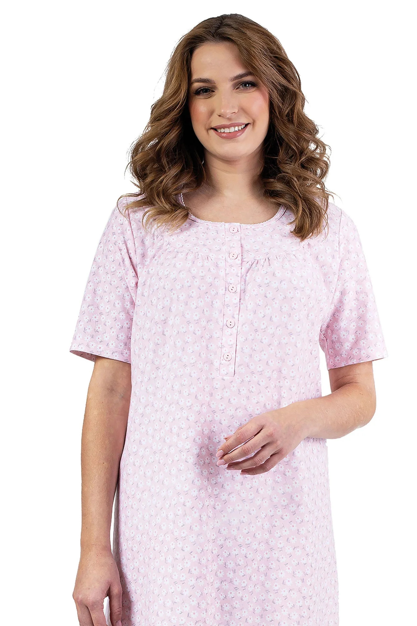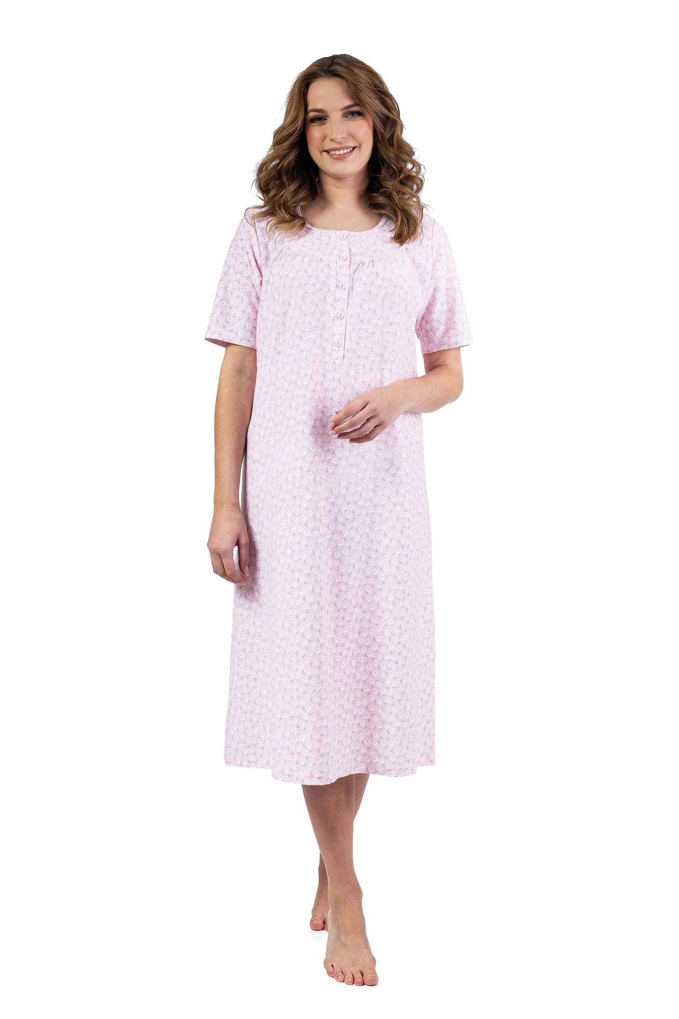 Dámská noční košilka 013 pink REGINA - růžová barva - z vysoce jakostní bavlny - se vzorem - kulatý výstřih - krátké rukávy - zapínání na knoflíky