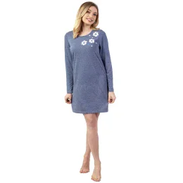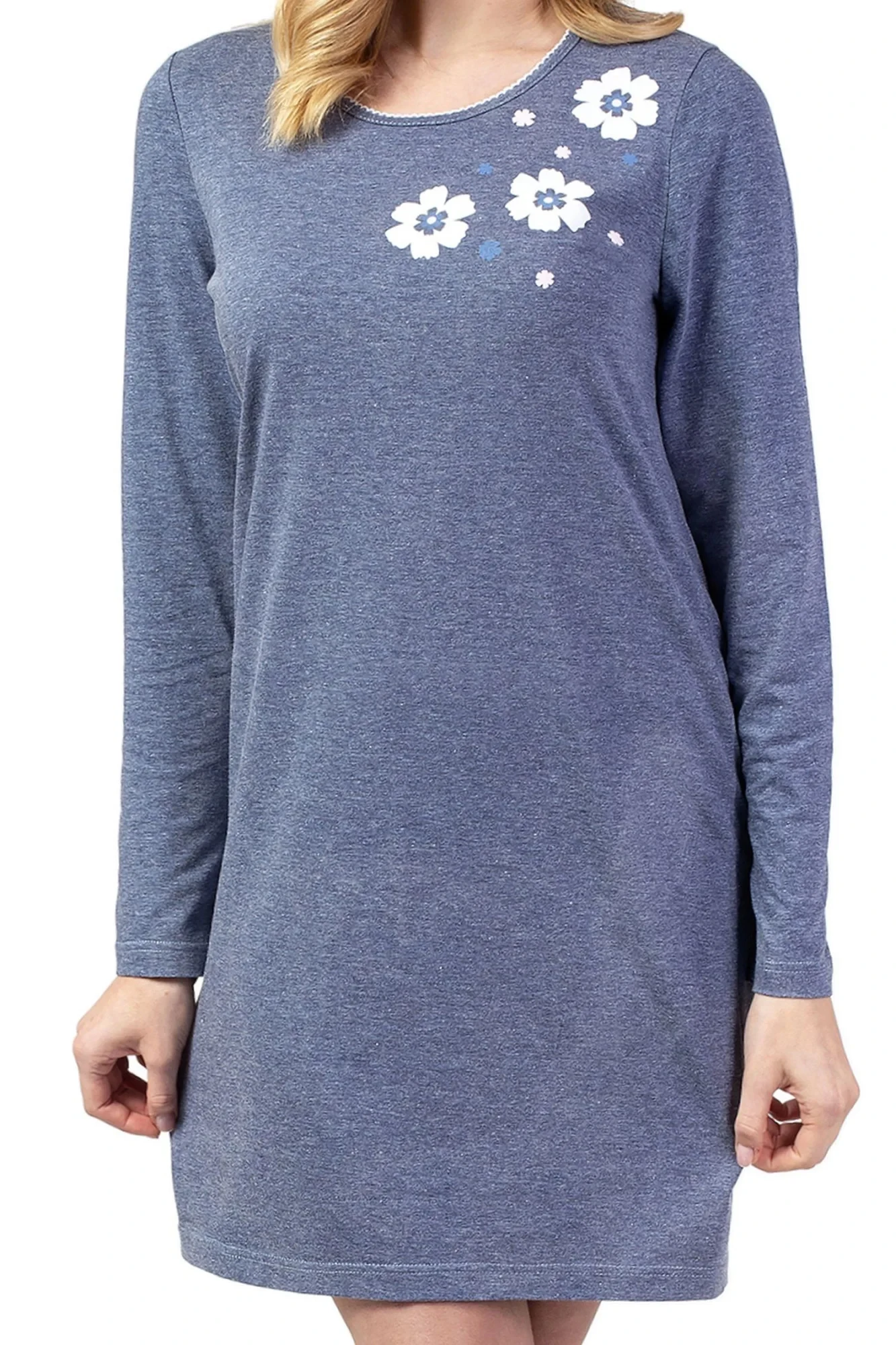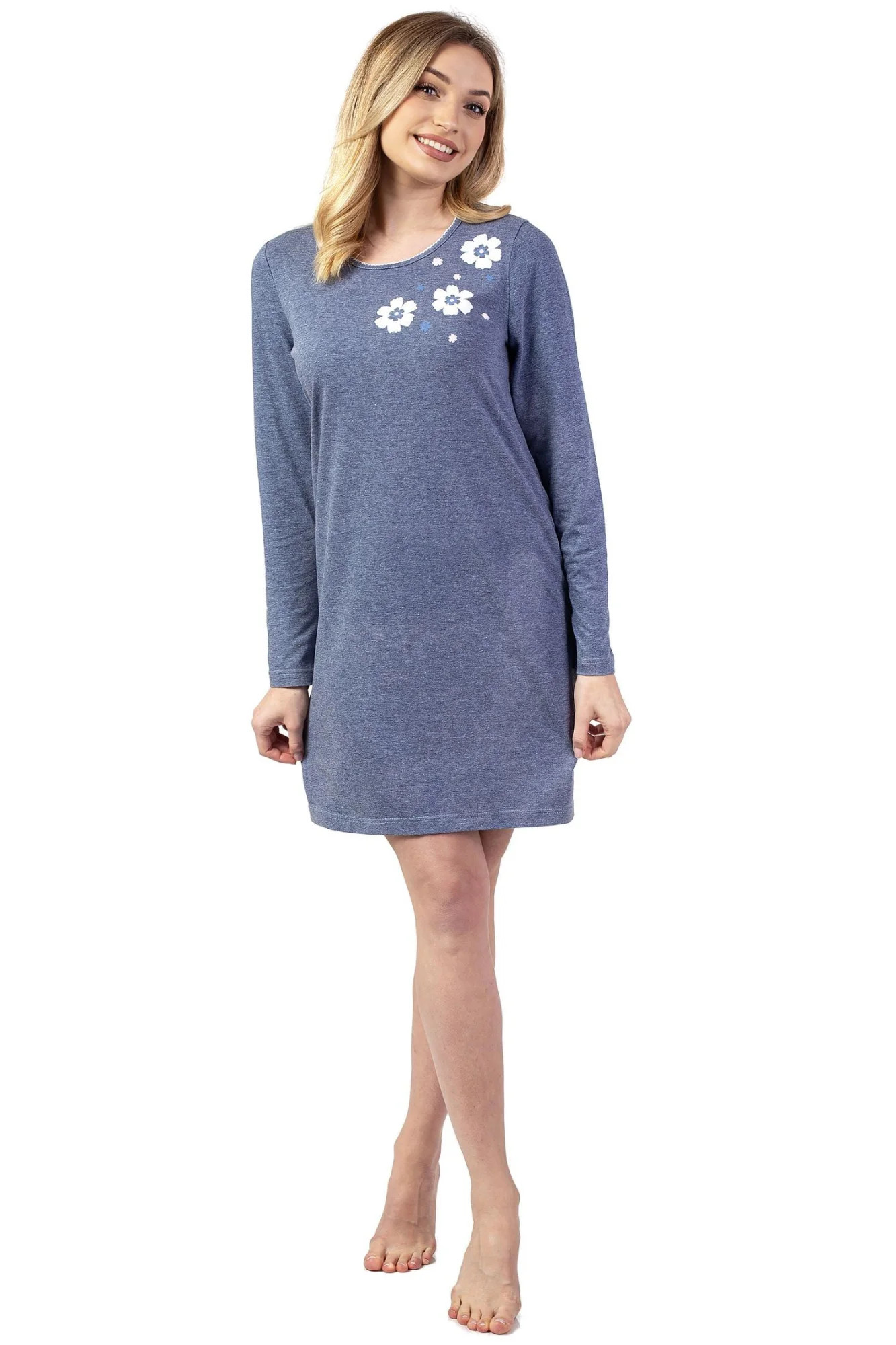 Dámská noční košilka 141 blue REGINA - tmavě modrá barva - z vysoce jakostní bavlny - na přední straně zdobené potiskem - dlouhé rukávy
