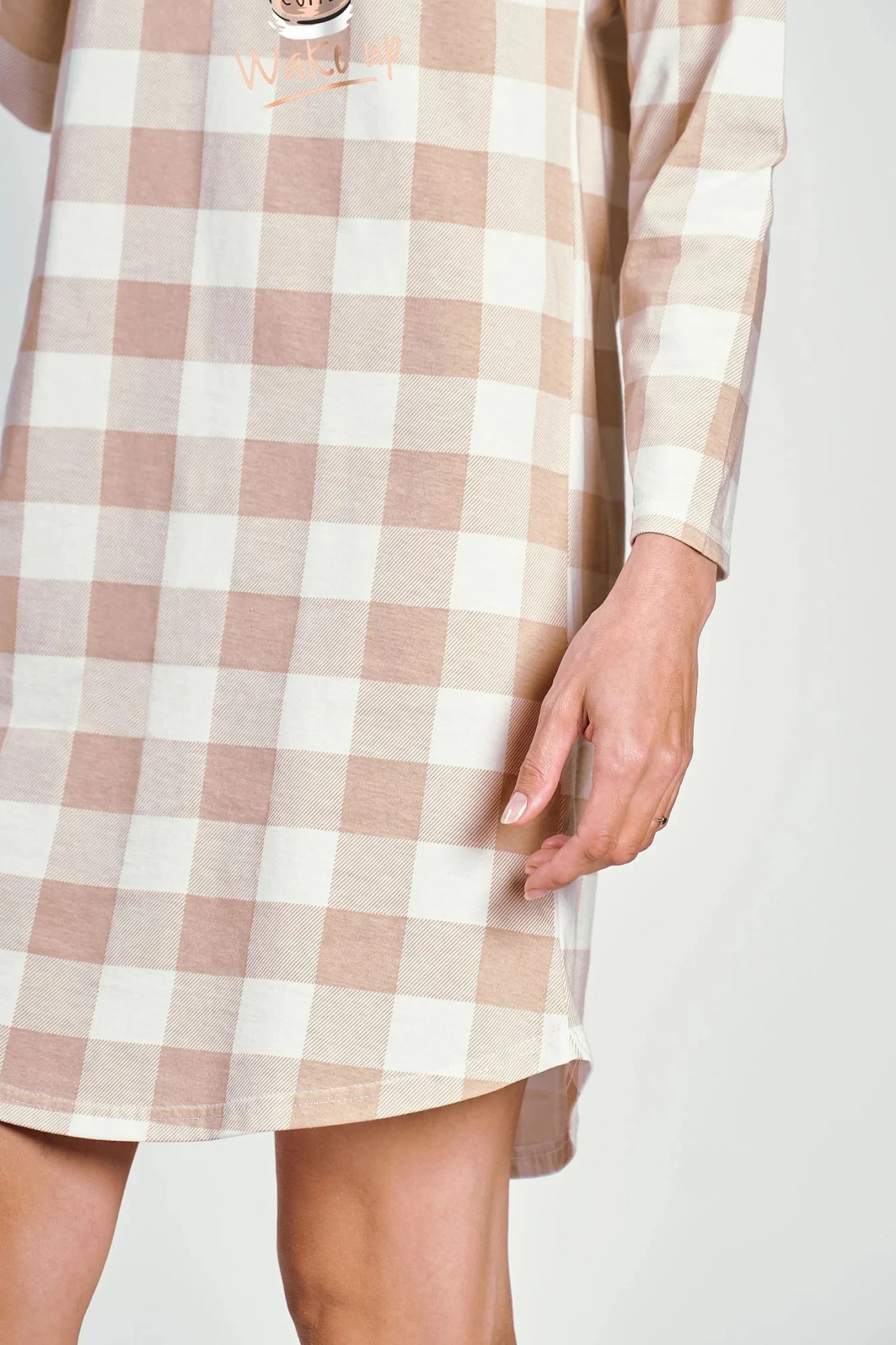 Dámská noční košilka 3224 Natalie TARO - béžová barva - z vysoce jakostní bavlny - s károvaným vzorem - na přední straně zdobené potiskem - dlouhé rukávy - spodní část mírně kulatá