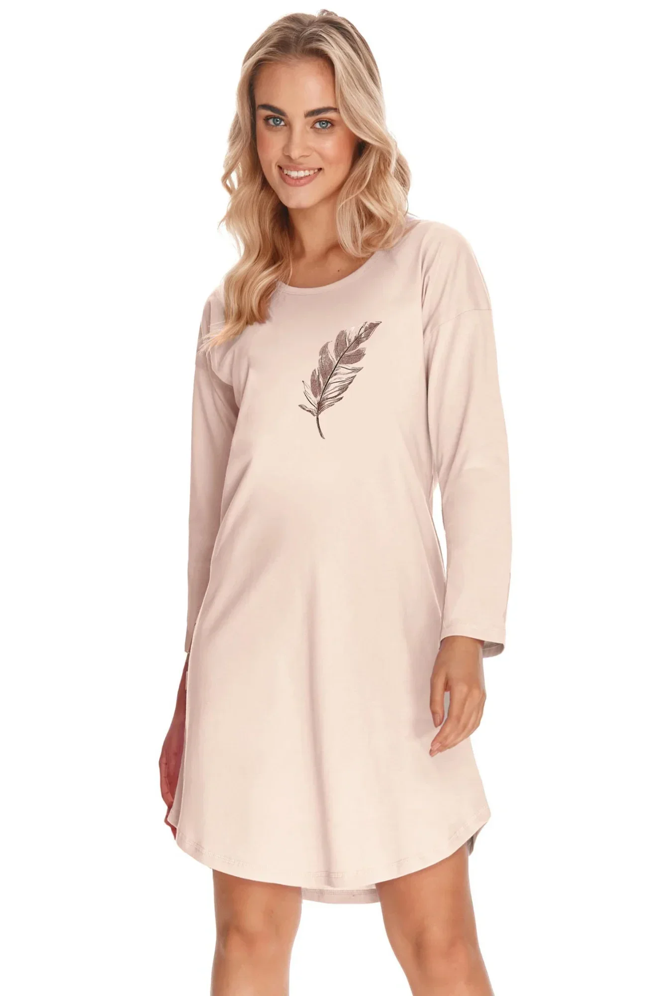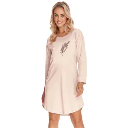 Dámská noční košilka 3288 Jane TARO - béžová barva - z vysoce jakostní bavlny - dlouhé rukávy - na přední straně zdobená potiskem - spodní část zakončená jemným řasením