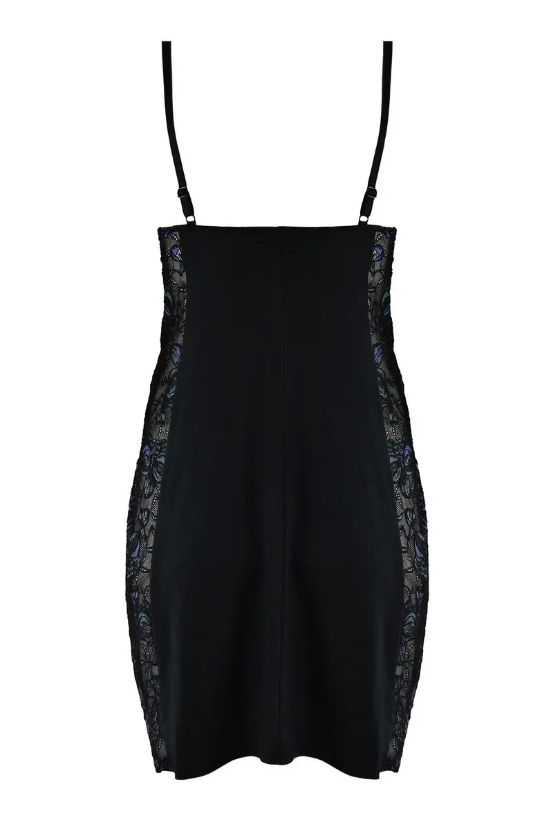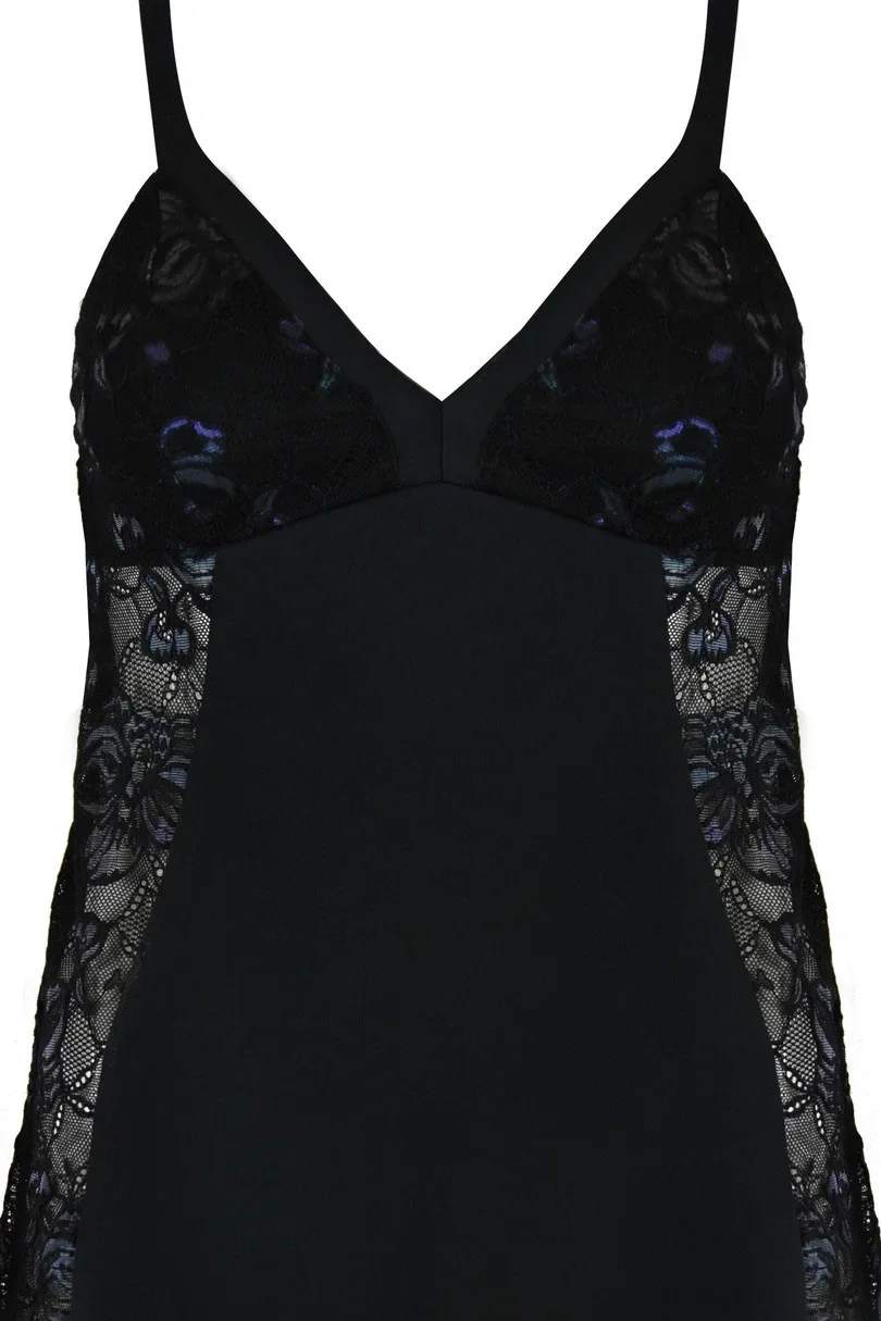 Neobyčejná dámská noční košilka s boky z průsvitného materiálu s květinovým vzorem.