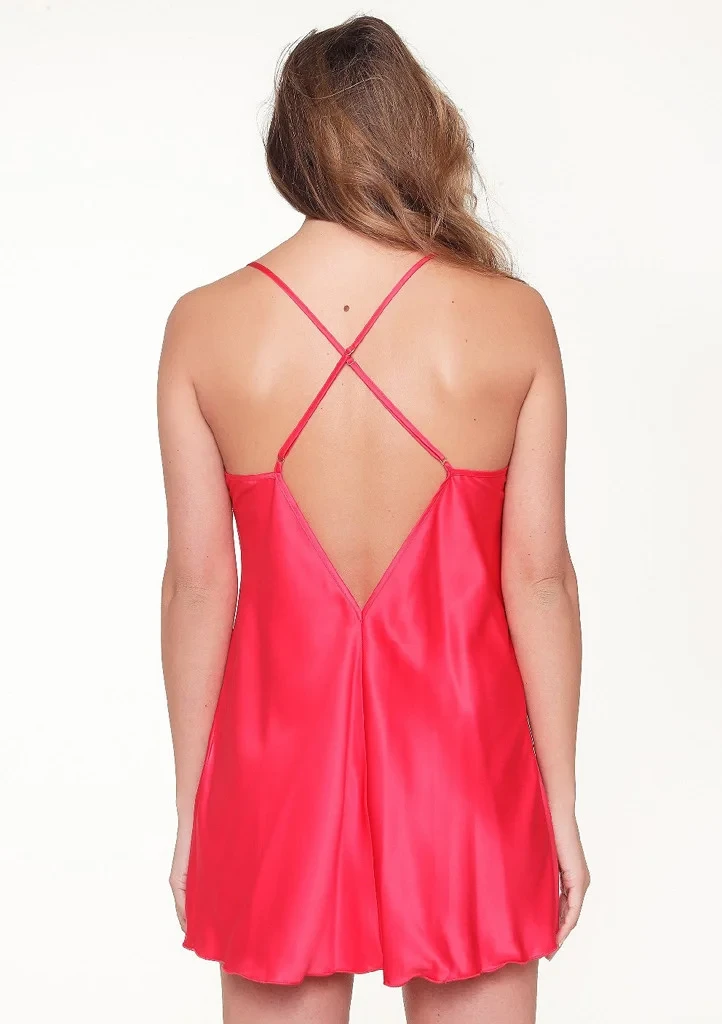 Dámská noční košilka značky Lingadore. Košilka je ušitá ze saténové látky, v přední části na hrudníku je našitá pružná krajka. Košilka má tenká ramínka, která se vzadu překřižují, ramínka se dají délkově nastavit. Vzadu má košilka výstřih do "V". Košilka je kratší, je mírně rozšířená.