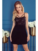 Košilka má krajkovou korzetovou část. Tenká ramínka se v dekoltu křižují.