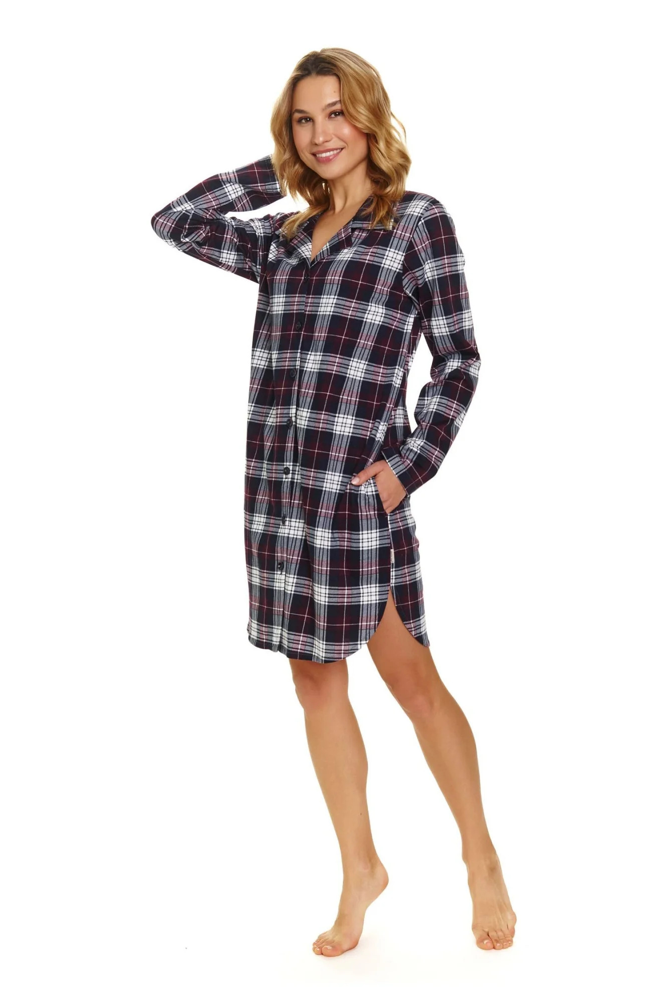 Dámská noční košilka 7103 Doctornap - vínová barva - z vysoce jakostní bavlny - vzor káro - košilový typ - s límečkem - zapínání na knoflíky