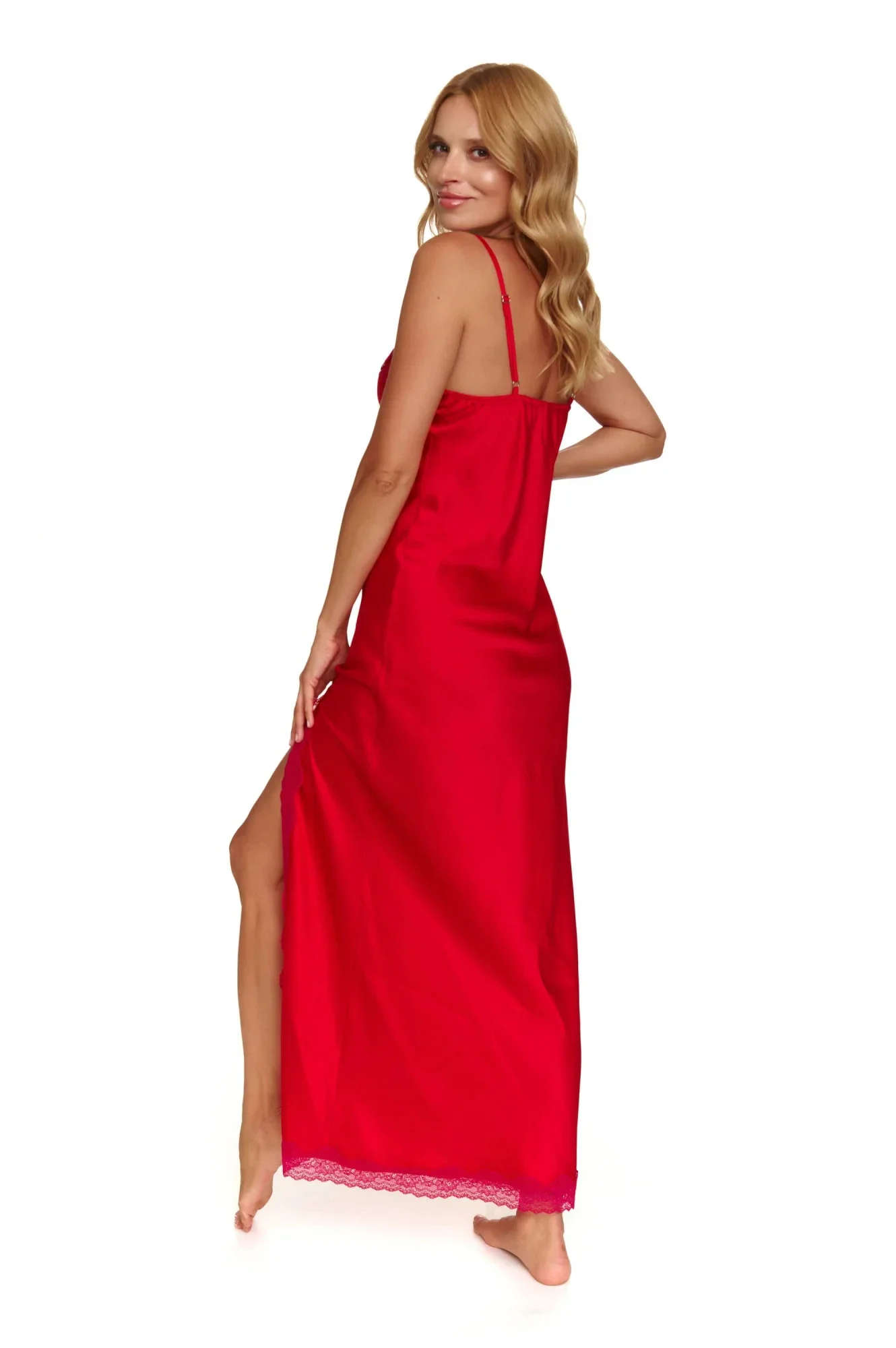 Dámská noční košilka 7170 Scarlett Doctornap - červená barva - z vysoce jakostního saténu - dekolt zdobený krajkou - tenká regulovatelná ramínka - rozparek a spodní část lemovaná krajkou