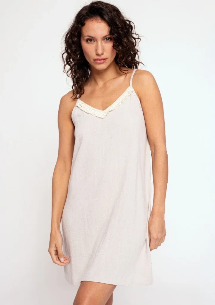 Dámská noční košilka značky Muydemi. Košilka je ušitá z viskózy, v přední části na hrudníku je našitá pružná krajka. Košilka má tenká ramínka. Košilka má výstřih do "V". Košilka má délku nad kolena.