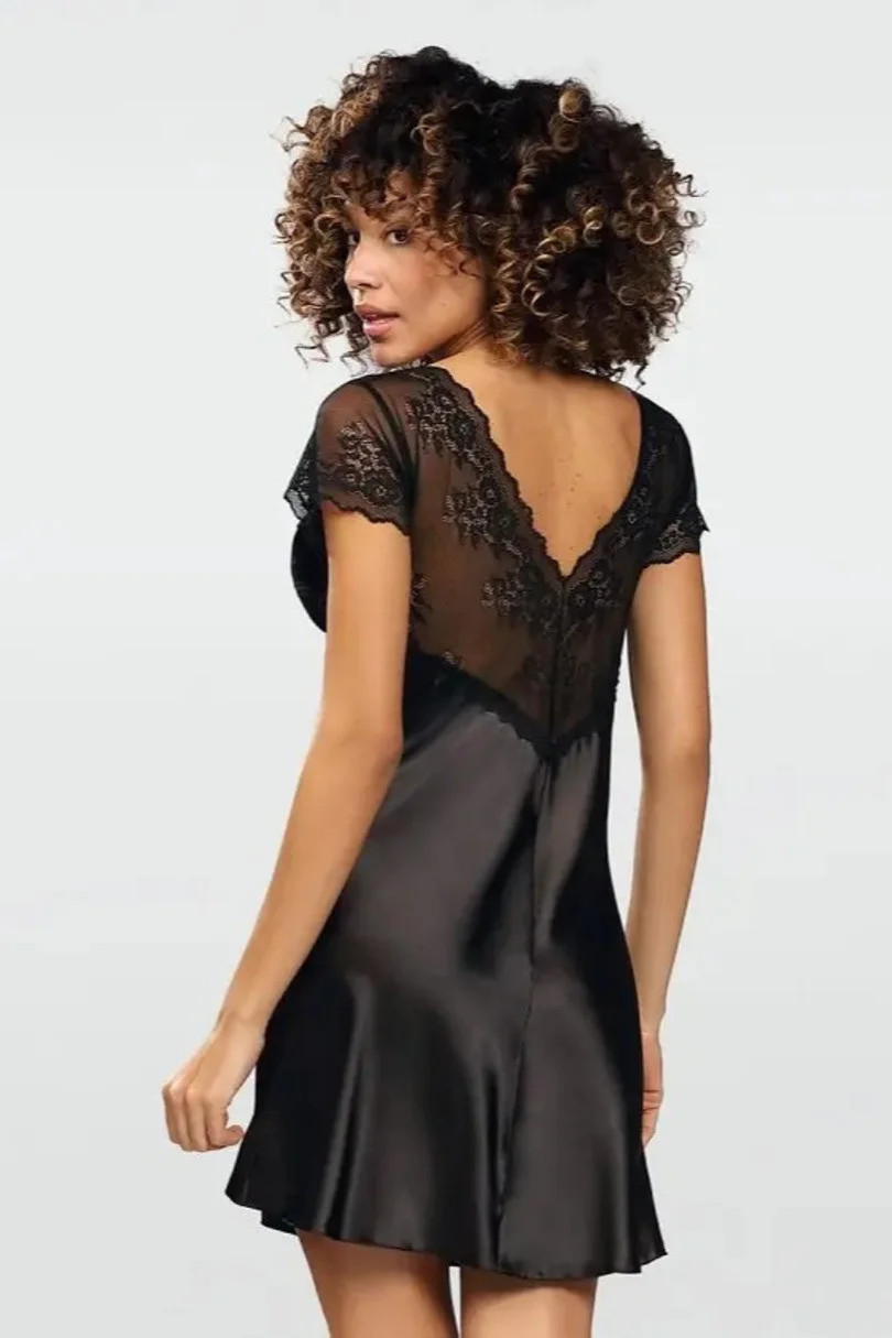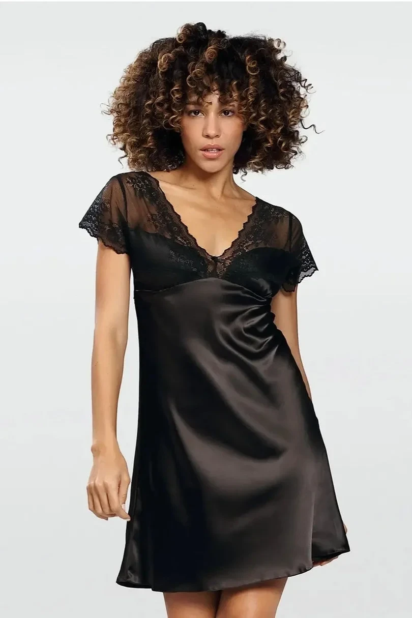 Saténová dámská noční košilka s krátkými rukávy.