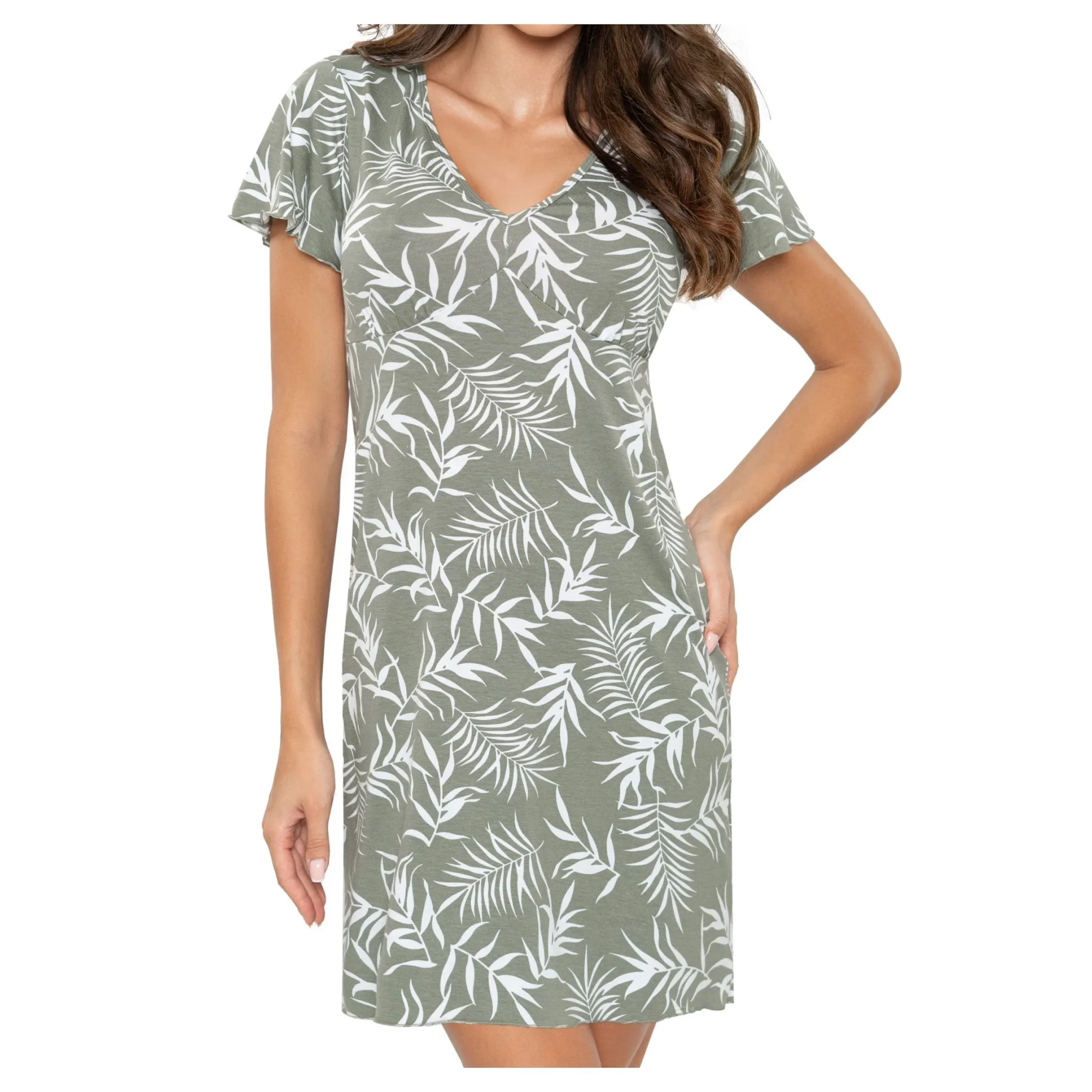 Dámská noční košilka Paloma Donna - olivová barva - z vysoce jakostní viskózy - krátké rukávy - výstřih ve tvaru V - se vzorem s květinovým motivem