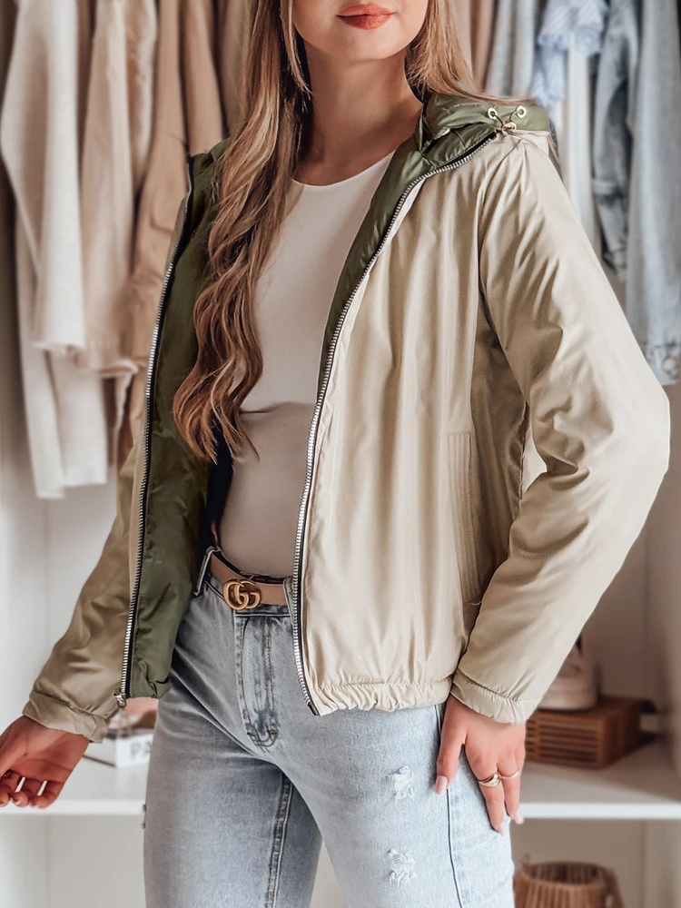 Tato oboustranná přechodná bunda kombinuje modernost s módním designem. Pohodlná odepínací kapuce a regulace ve spodní části zajišťují dokonalé přizpůsobení. Dvě vnější kapsy a dvě vnitřní kapsy dodávají praktičnost. Univerzální střih je vhodný pro každodenní stylizaci a podtrhuje moderní vzhled.