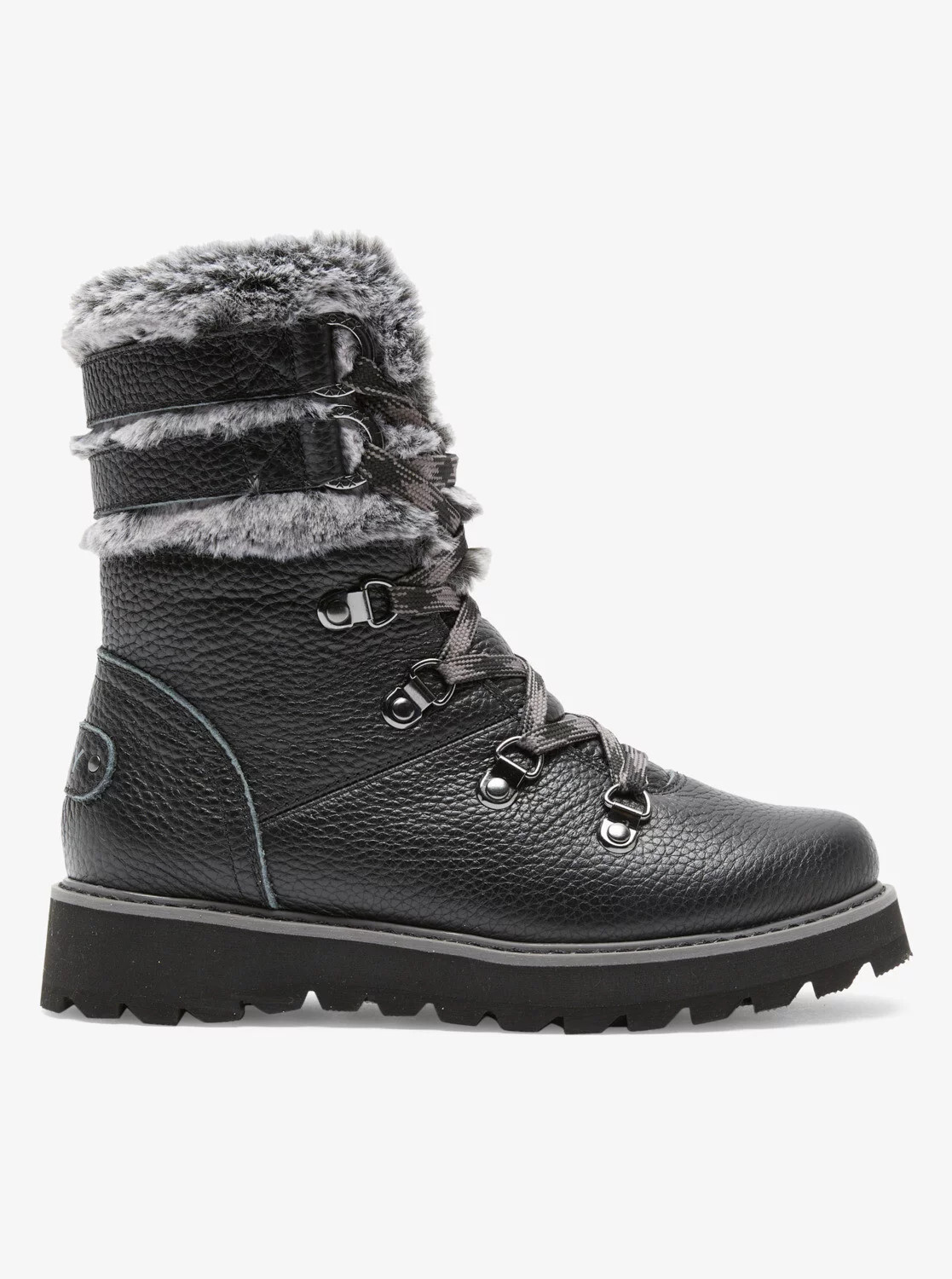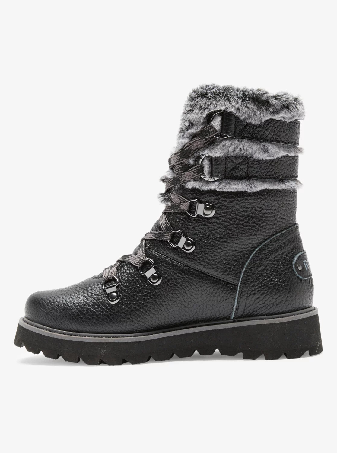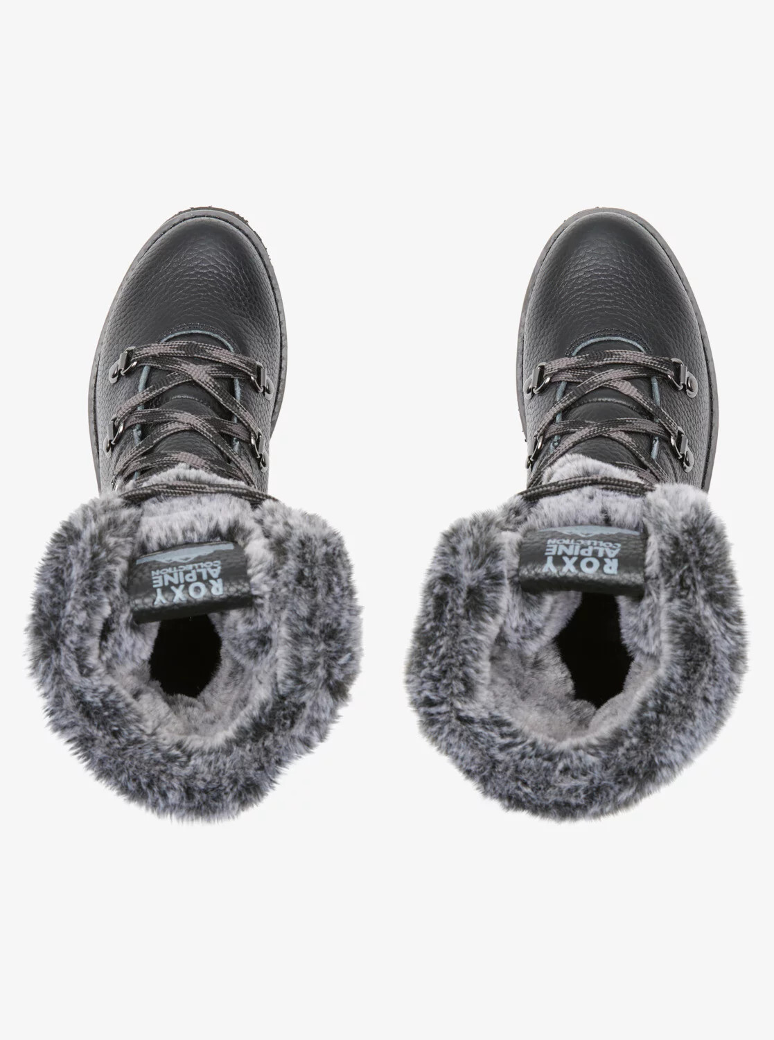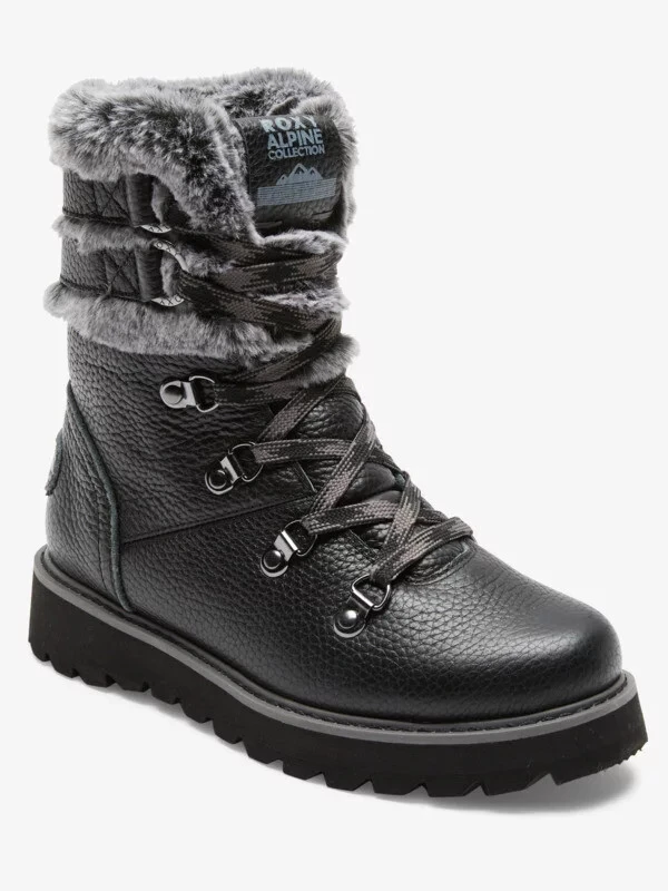 Šněrování s D-kroužky pro pevné uchycení. Gussetová jazyková část s polstrovaným límcem z falešné kožešiny pro extra pohodlí a teplo.