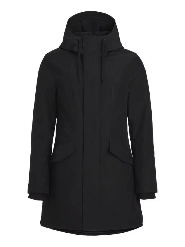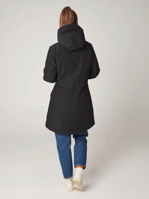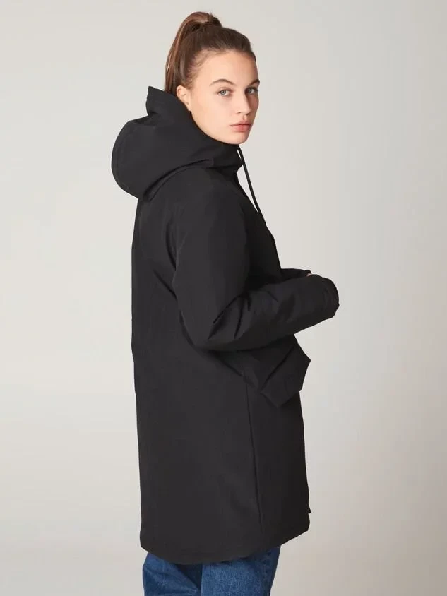 Aby se zabránilo pronikání vody do bundy, je hlavní zip vodoodpudivý a je skrytý za légou se zapínáním na suchý zip.