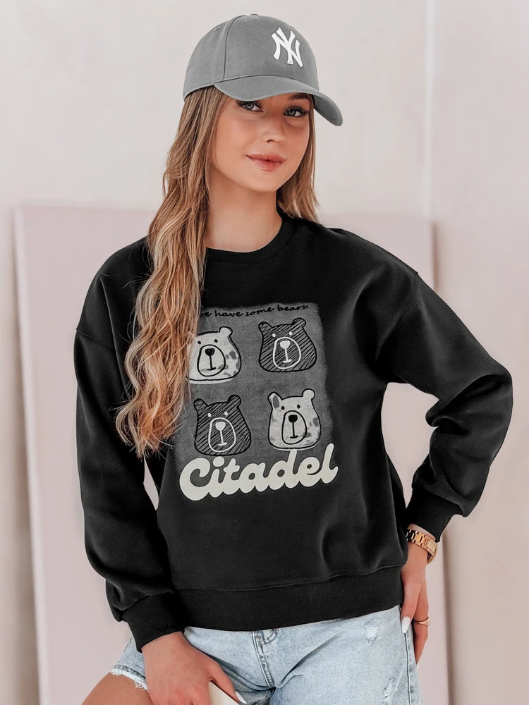 Bluza damska oversize z nadrukiem czterech misiów i dużym napisem "Citadel" to połączenie wygody i uroku. Wykonana z miękkiej, przyjemnej w dotyku tkaniny, świetnie sprawdza się zarówno w domowym relaksie, jak i podczas codziennych wyjść. Uniwersalny rozmiar pasuje od XS do L. Ściągacze na rękawach i dole zapewniają komfort noszenia oraz utrzymują fason, a luźny krój daje swobodę ruchów. Idealna do casualowych stylizacji na chłodniejsze dni wiosny.