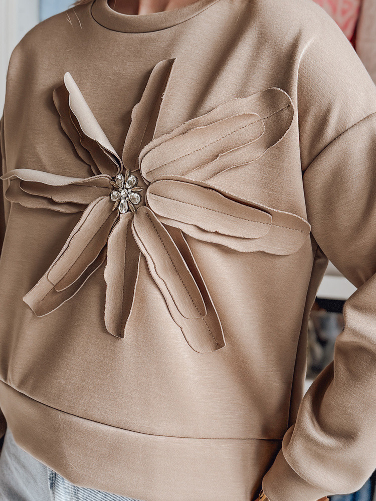 Bluza damska w kroju oversize, wyróżniająca się przestrzenną aplikacją w kształcie kwiatu z połyskującymi cyrkoniami. Uniwersalny rozmiar pasuje od XS do L. Minimalistyczny design łączy się z efektownymi detalami, tworząc nietuzinkowy element garderoby. Świetna do jeansów i spodni materiałowych.