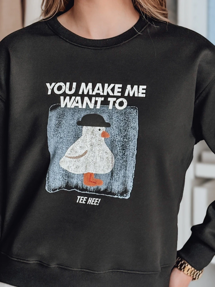 Bluza damska oversize o krótkim fasonie to propozycja dla miłośniczek stylu casual. Wygodny krój i miękki, przyjemny w dotyku materiał premium zapewniają komfort noszenia na co dzień. Model zdobi nadruk z zabawną grafiką oraz napisem, który dodaje całości uroku. Uniwersalny rozmiar pasuje od XS do L. Ściągacze na dole i przy rękawach podkreślają luźny, ale estetyczny fason. Bluza idealnie wpisuje się w aktualnie trendy.