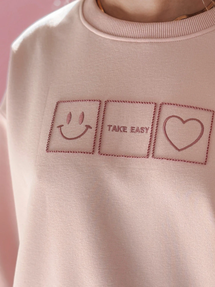 Dámská mikina oversize s vyšívanými motivy včetně úsměvu, srdce a nápisu "TAKE EASY". Pohodlný styl přes hlavu s kulatým výstřihem a žebrovanými manžetami a lemem. Univerzální velikost padne od XS do L. Měkká tkanina pro každodenní pohodlí. Ideální pro jarní dny, kdy se počítá ležérnost a styl v jednom.
