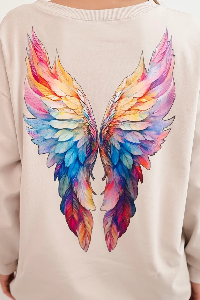 Stylová a pohodlná dámská oversize mikina vyrobená z vysoce kvalitní bavlny je must-have v každém dámském šatníku. Jejím výjimečným prvkem je efektní potisk barevných křídel na zádech, který dodává charakter a přitahuje pohledy. Na přední straně mikiny se nachází menší, přizpůsobený potisk, který vytváří soudržný a módní celek.